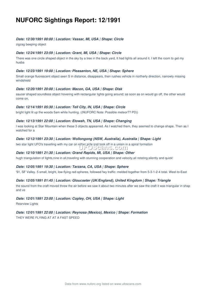 This document is a compilation of twelve Unidentified Aerial Phenomena (UAP) sightings reported to the National UFO Reporting Center (NUFORC) during the month of December 1991. The reports span various locations, including the United States, the United Kingdom, Mexico, and Australia. The sightings describe a diverse range of phenomena, including circular, spherical, triangular, and saucer-shaped objects. Reported behaviors include hovering, rapid movement, formation flying, and light-based displays. Specific incidents include a 'zigzag beeping object' in Vassar, Michigan; a soundless saucer-shaped object in Macon, Georgia; and a formation of nine lights in Grand Rapids, Michigan, described as moving with 'stunning cooperation and velocity.' One report from Tell City, Indiana, includes a note from NUFORC suggesting the possibility of a meteor. Another report from Gloucseter, United Kingdom, notes that the sound of the craft preceded its visual appearance. The document serves as a chronological log of these civilian-reported events.