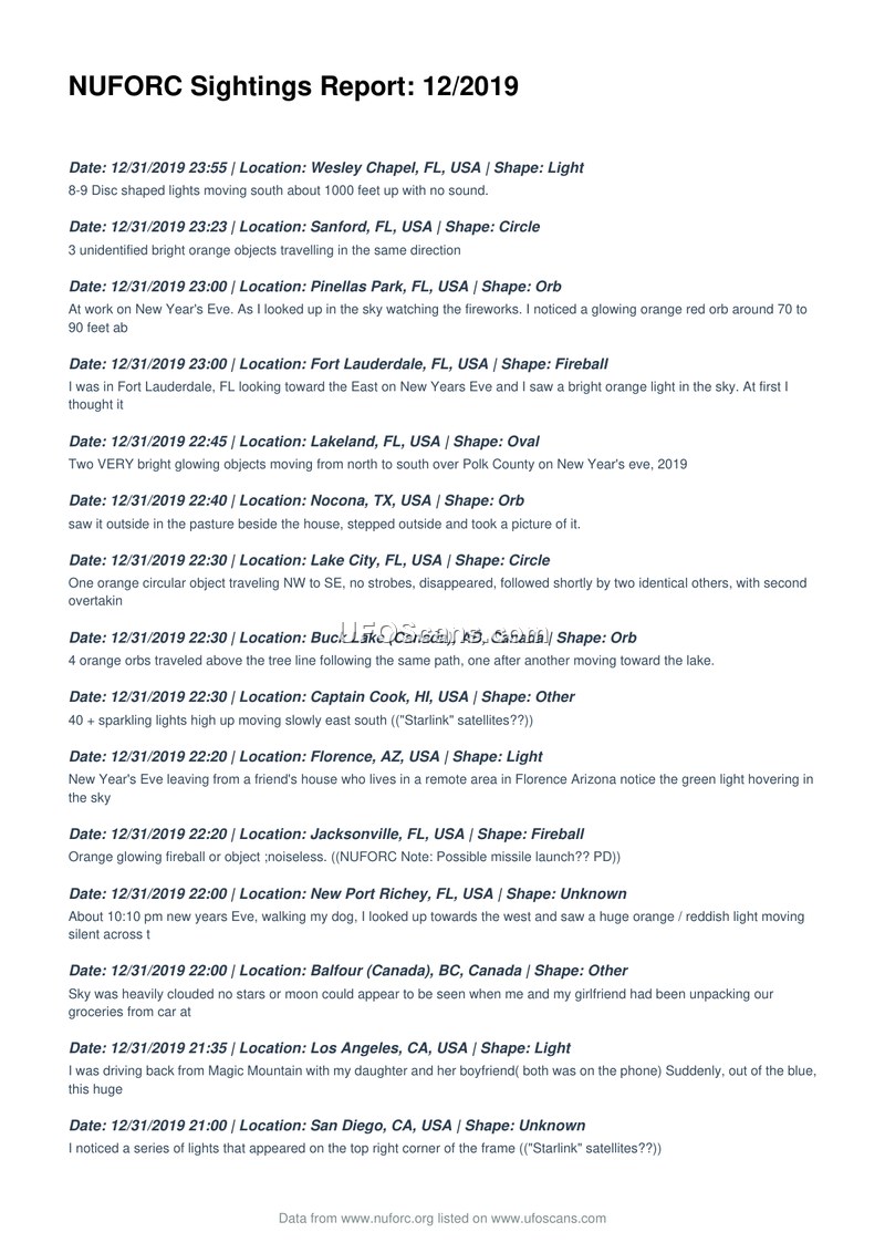 This document is a comprehensive compilation of Unidentified Aerial Phenomena (UAP) sighting reports submitted to the National UFO Reporting Center (NUFORC) for the month of December 2019. The report spans 46 pages and catalogs hundreds of individual accounts from witnesses across the United States, Canada, the United Kingdom, and several other international locations. The sightings are presented in reverse chronological order, beginning with reports from December 31, 2019, and concluding with reports from the beginning of the month. The descriptions provided by witnesses are highly varied, encompassing a wide range of shapes, including orbs, lights, triangles, disks, cigars, fireballs, and formations. Many reports describe objects moving in straight lines, often in large groups, which frequently led witnesses to speculate about the presence of 'Starlink' or 'Spacelink' satellites. Other accounts detail more anomalous behaviors, such as objects hovering, changing colors, performing erratic maneuvers, or appearing and disappearing instantaneously. Several reports mention the use of MADAR (Multiple Anomaly Detection and Automated Recording) nodes, indicating a technical monitoring component to some of the data collection. The document also includes anecdotal reports of close encounters, including claims of abduction, metallic objects, and objects interacting with local infrastructure or aircraft. The tone of the reports is informal, reflecting the personal experiences of the observers. While many reports are brief, some provide specific details regarding the time, location, and visual characteristics of the phenomena. The document serves as a raw data repository for public-submitted sightings, with minimal editorial intervention, though some entries include brief notes from NUFORC regarding potential explanations, such as advertising lights, satellites, or meteor activity.
