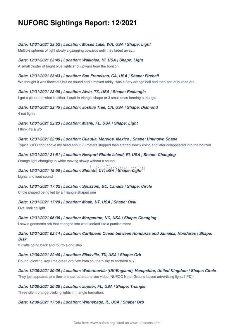 The document is a chronological list of UFO sightings reported to the National UFO Reporting Center during December 2021, spanning various global locations and object descriptions.