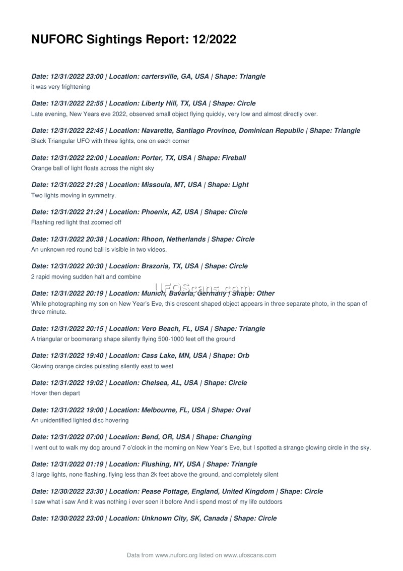 This document is a monthly compilation of hundreds of UAP sighting reports submitted to the National UFO Reporting Center in December 2022. It provides a chronological record of witness accounts, locations, and object descriptions from around the world.