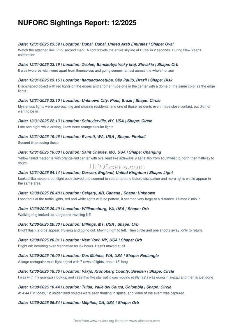 NUFORC Sightings Report: 12/2025