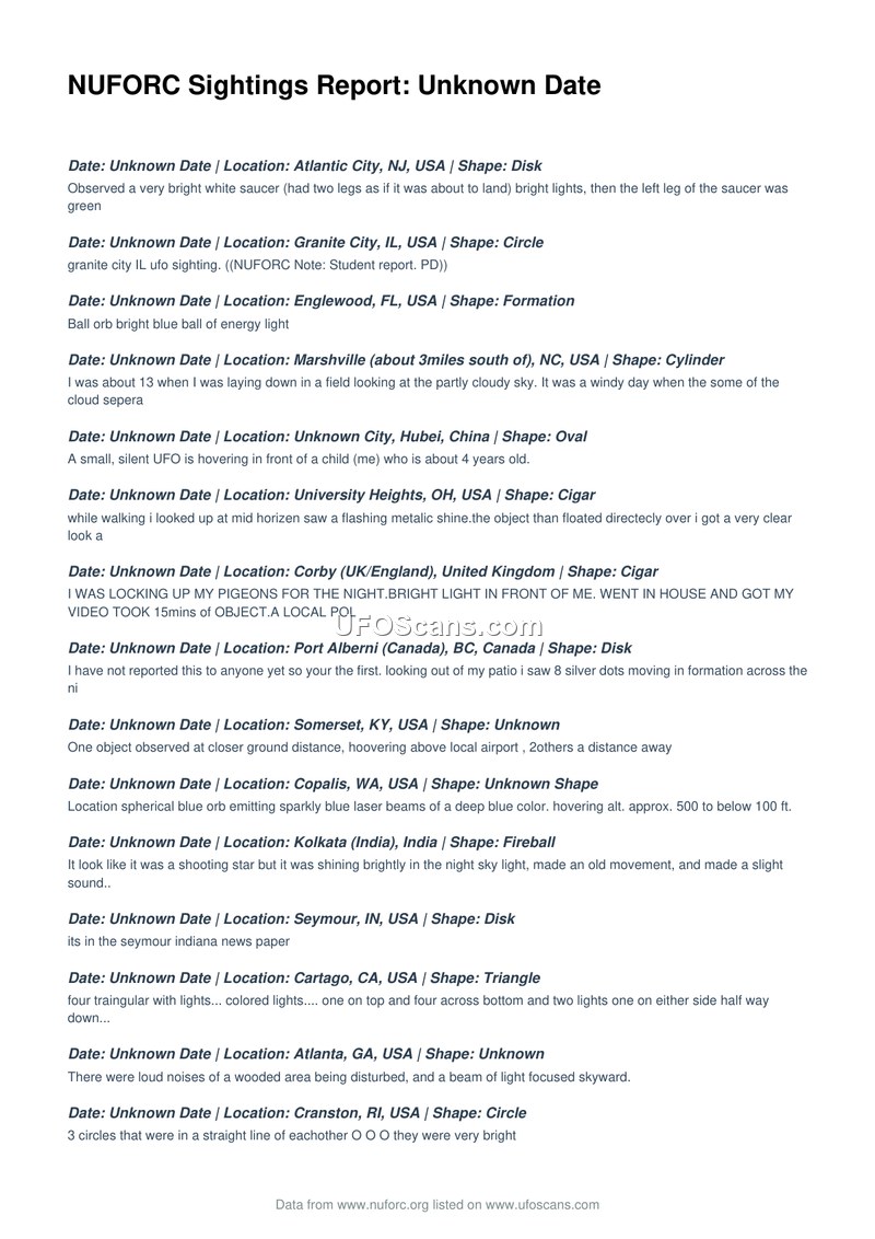 NUFORC Sightings Report: Unknown Date