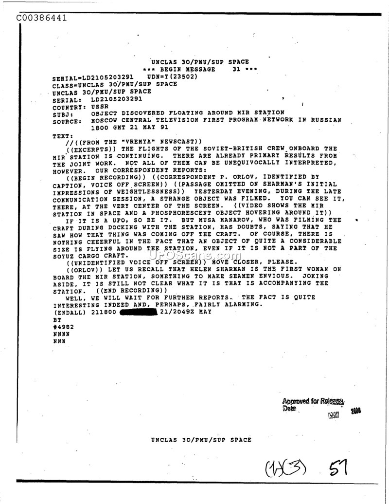 A news transcript from May 1991 reports that a phosphorescent, unidentified object of significant size was filmed hovering near the Mir space station by crew member Musa Manarov.