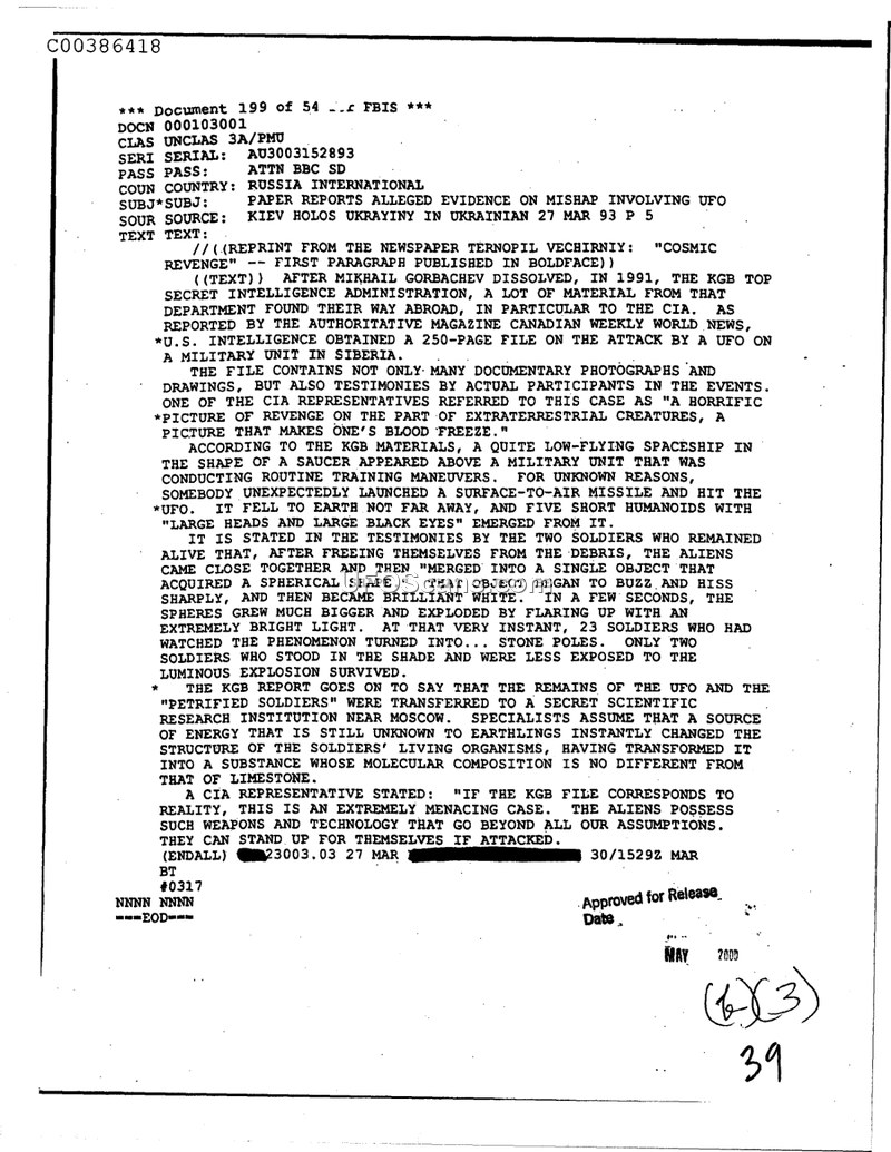 This document is an FBIS report dated March 27, 1993, summarizing a story published in the newspaper Ternopil Vechirniy, which itself cites a Canadian publication. The report details the existence of a purported KGB top-secret file, allegedly obtained after the 1991 dissolution of the Soviet Union. According to the report, U.S. intelligence acquired a 250-page file concerning a UFO incident in Siberia. The file reportedly contains photographs, drawings, and testimonies regarding a saucer-shaped craft that appeared over a military unit. The document claims that the military unit launched a surface-to-air missile, striking the craft. Following the impact, five short humanoids with large heads and black eyes emerged. Two surviving soldiers testified that the aliens merged into a single spherical object that began to hiss and emit a bright light. This light reportedly caused 23 soldiers who were observing the event to turn into stone poles. The report further states that the remains of the craft and the petrified soldiers were transferred to a secret scientific research institution near Moscow. Specialists allegedly found that the molecular composition of the soldiers had been transformed into a substance similar to limestone. A CIA representative is quoted as describing the incident as a 'horrific picture of revenge' and noting that the aliens possess technology that exceeds human assumptions.