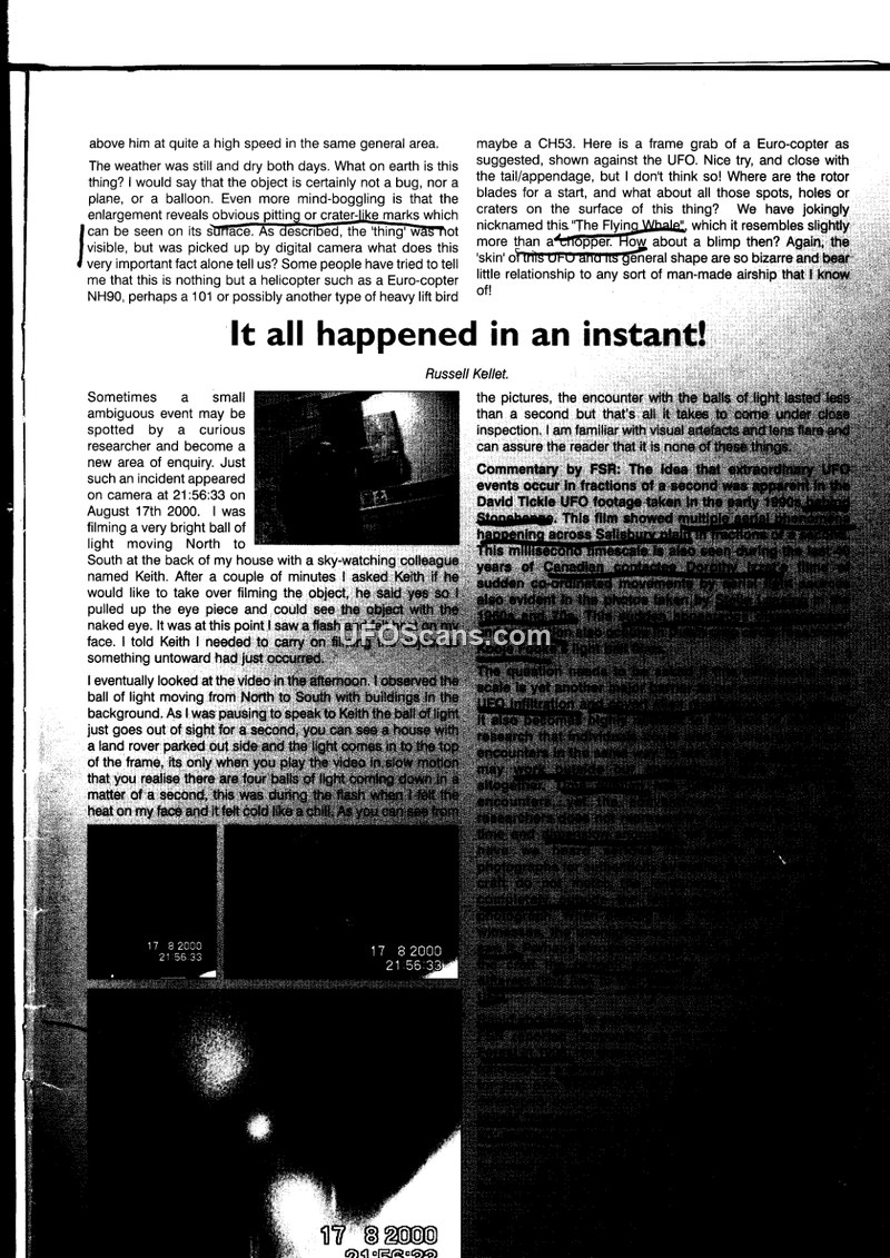 This document is a personal account by Russell Kellet regarding a UFO sighting that occurred on August 17, 2000, at 21:56:33. Kellet, accompanied by a colleague named Keith, was filming in the vicinity of the Salisbury Plain when he observed a bright ball of light moving from North to South. Kellet describes a flash and a physical sensation of heat followed by a cold chill on his face during the encounter. Upon reviewing the video footage, Kellet observed that what appeared to be a single ball of light was actually four balls of light descending. The author notes that the object displayed 'pitting or crater-like marks' on its surface, which he compares to a 'Flying Whale' rather than a conventional aircraft like a helicopter or blimp. The document also references other historical UFO footage, including cases involving David Tickle and Dorothy Izatt, to contextualize the phenomenon of rapid, co-ordinated aerial movements. The author emphasizes that the entire event lasted less than a second.