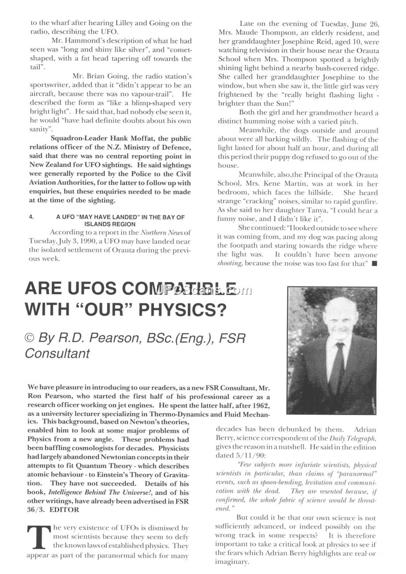 This document is a compilation of articles and reports concerning Unidentified Aerial Phenomena (UAP). The first section details sightings in the Orauta region of New Zealand. On June 26, 1990, Maude Thompson and her granddaughter Josephine Reid observed a bright, flashing light near a ridge, accompanied by a humming noise and cracking sounds. The local school principal, Kene Martin, also reported hearing strange noises and observing her dog's distress. Squadron-Leader Hank Moffat of the New Zealand Ministry of Defence noted that there was no central reporting point for such sightings, which were typically handled by the police and civil aviation authorities. A subsequent report mentions a potential landing in the Bay of Islands region on July 3, 1990. The document then shifts to a theoretical analysis by R.D. Pearson, an FSR Consultant, who argues that UFOs might be compatible with physics if one rejects certain aspects of Einstein's relativity in favor of an 'ether' model and a 'computing grid' theory. Pearson suggests that these models could explain how UAP travel and remain invisible. Finally, the document recounts a sighting by Andrew Burton, an English schoolteacher, on January 3, 1991, near Olivella, Spain. While driving at night, Burton observed a yellow light through the trees, which caused his car's engine to cut out and its lights to flicker. After the light passed, his car's digital clock stopped working, though he suffered no physical ill effects.
