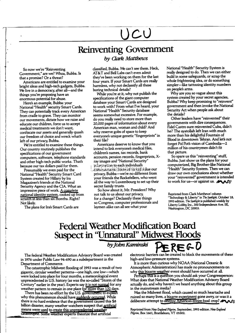 This document is a compilation of two columns published in The Spotlight and New England Pilgrim in 1993. The first column, written by Clark Matthews, critiques the proposed National Health Security Smart Card, arguing that it represents a significant threat to individual privacy and civil liberties. Matthews expresses skepticism regarding the government's intentions, suggesting that the system could be used for mass surveillance and data collection on citizens' medical and financial records. He highlights the involvement of the National Security Agency and the CIA in the project's development. The second column, written by John Kaminski, focuses on the 1993 Midwest floods. Kaminski questions the official narrative surrounding the disaster, pointing to the existence of the Federal Weather Modification Advisory Board, established in 1976. He suggests that the floods, which lasted for four months, were not a natural weather event and implies that artificial means may have been used to create the catastrophe, questioning why the National Oceanic & Atmospheric Administration failed to provide adequate explanations for the weather patterns.