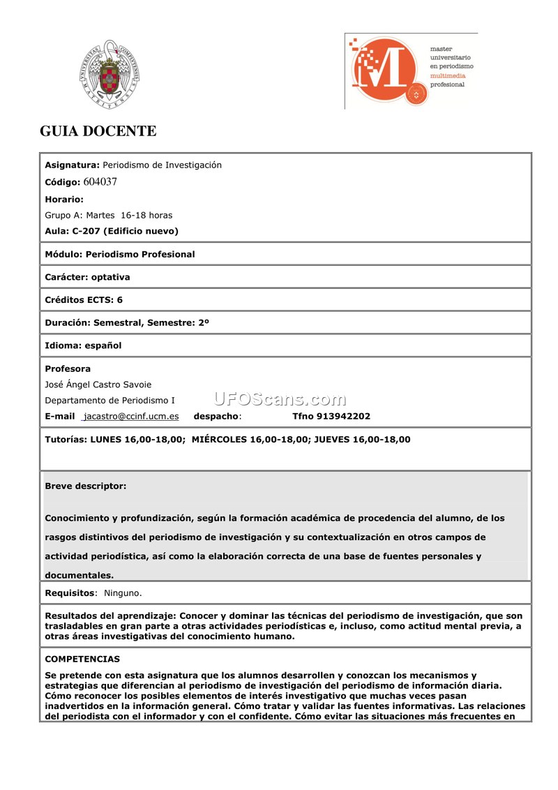 This document is the official syllabus for the Investigative Journalism course at the Complutense University of Madrid. It details the curriculum, grading criteria, and recommended bibliography for students enrolled in the Master's program.