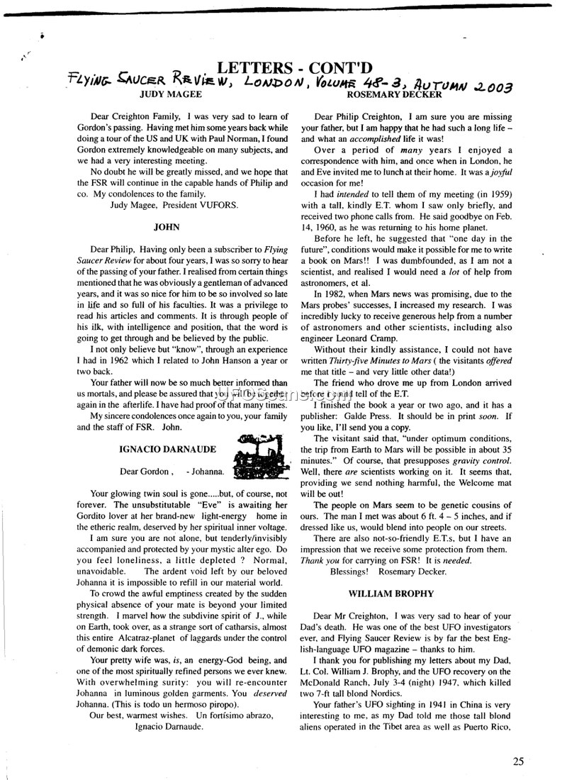 This document consists of a collection of letters published in the Autumn 2003 issue of the Flying Saucer Review (Volume 48-3). The primary purpose of these letters is to express condolences to Philip Creighton following the death of his father, Gordon Creighton, a prominent UFO investigator and editor of the publication. Contributors include Judy Magee (President of VUFORS), Rosemary Decker, William Brophy, Michel Granger, Chris Rolfe, Donald Lewis, Ignacio Darnaude, Juan Carlos Orofino, Yvonne Howe, Núria Ribera, and Franck Boitte. Beyond the expressions of grief, the letters contain personal anecdotes regarding Gordon Creighton's influence on the field of ufology, his correspondence with various researchers, and his support for the publication. Rosemary Decker recounts personal experiences with extraterrestrial encounters and mentions her book 'Thirty-five Minutes to Mars'. William Brophy references his father's involvement in the 1947 McDonald Ranch UFO recovery. Other contributors discuss the global reach of the Flying Saucer Review and the enduring legacy of the researchers involved in the field.