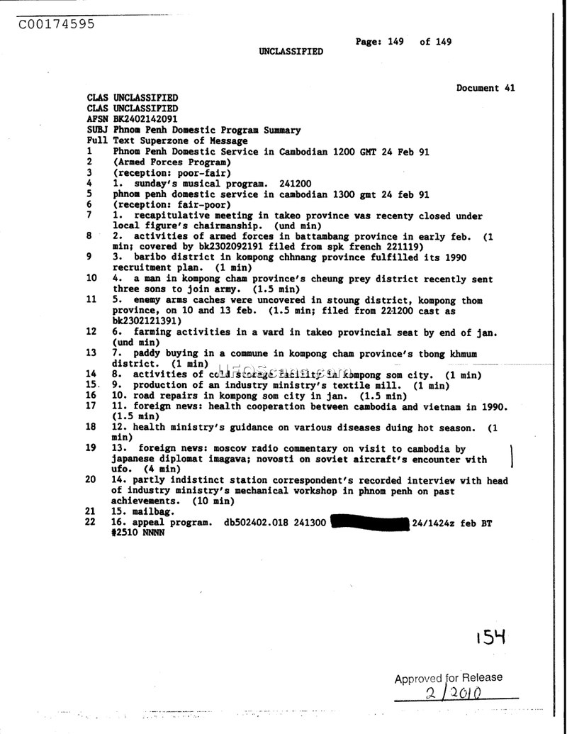 This document is a summary of the Phnom Penh Domestic Service broadcast from February 24, 1991. The report outlines various domestic activities in Cambodia, including military and administrative updates. Notable events mentioned include a recap of a meeting in Takeo province, armed forces activities in Battambang province, and recruitment efforts in Kompong Chhnang province. The report also notes the discovery of enemy arms caches in Stoung district, Kompong Thom province, and various local infrastructure and agricultural updates, such as road repairs in Kompong Som city and paddy buying in Kompong Cham province. Additionally, the document references international news, specifically a Moscow radio commentary regarding a visit to Cambodia by a Japanese diplomat and a report on a Soviet aircraft's encounter with a UFO. The summary concludes with a mention of a recorded interview with the head of the industry ministry's mechanical workshop in Phnom Penh.