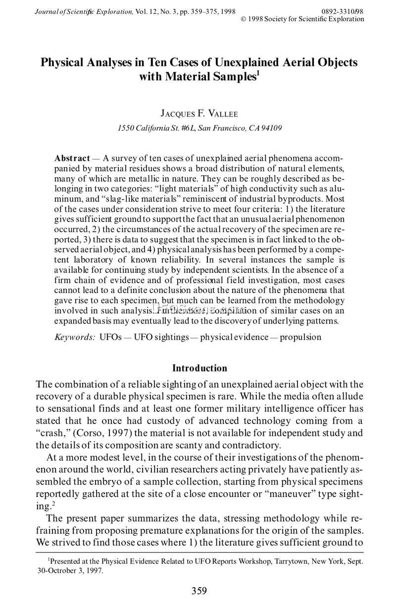 This paper, authored by Jacques F. Vallee and published in the Journal of Scientific Exploration in 1998, provides a methodological survey of ten cases of unexplained aerial phenomena where physical material samples were recovered. Vallee establishes four criteria for inclusion: sufficient evidence of an unusual aerial phenomenon, documented recovery circumstances, a link between the specimen and the object, and analysis by a competent laboratory. The author utilizes the Hatch catalogue, which contains over 15,000 reports, to categorize these incidents using a system derived from J. Allen Hynek. The cases examined range from the 1897 Aurora, Texas, incident to cases in the 1970s, including incidents in Brazil, Sweden, the United States, and Colombia. The physical samples are broadly classified into two categories: 'light materials' of high conductivity, such as aluminum and magnesium, and 'slag-like materials' reminiscent of industrial byproducts. Detailed analysis of the Council Bluffs, Iowa, incident (1977) is provided as a primary case study, where molten metal was recovered and analyzed by Iowa State University and the Griffin Pipe Products company, ultimately being identified as carbon steel. Despite the lack of exotic elements or advanced structural designs in any of the ten cases, Vallee argues that the comparative analysis of these materials is valuable. He notes that the composition of the samples is often consistent with witness accounts, which supports the thesis that an unidentified phenomenon is manifesting through a physical, material support. The author concludes that the current polarization between advocates and adversaries of the extraterrestrial hypothesis has impoverished the debate, and he calls for better standards in data gathering, field investigation, and collaborative research to move beyond the current impasse.