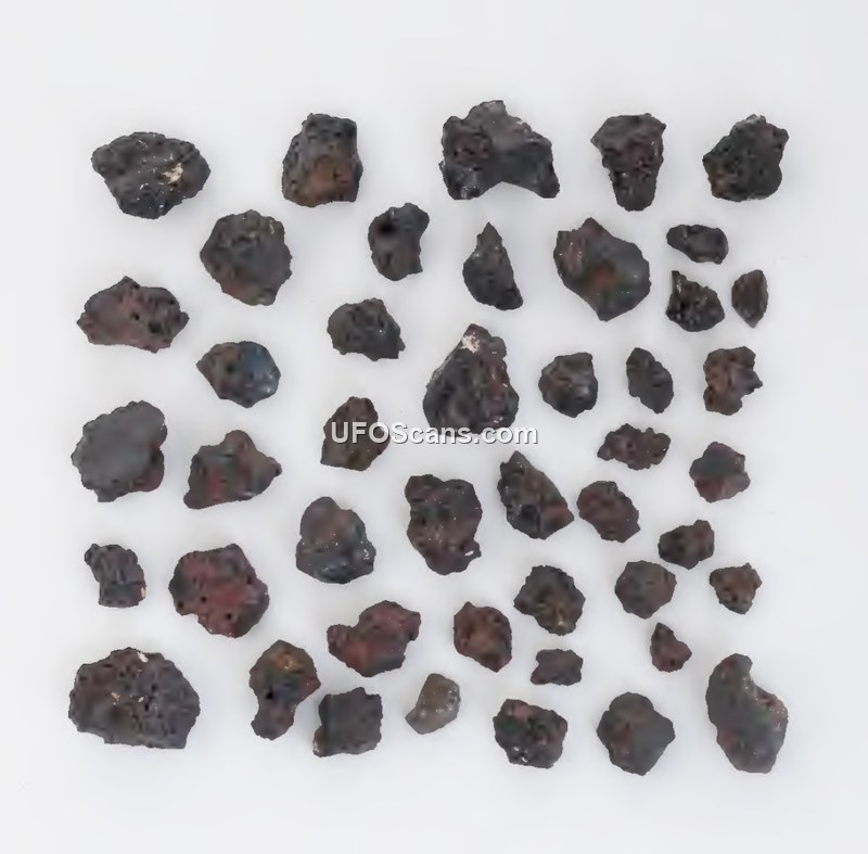 This document contains photographic evidence of a collection of rock-like fragments sent to Dr. J.A. Hynek in 1959, related to a case in Dayton, Ohio. It serves as an archival record of physical evidence associated with a 1959 incident.