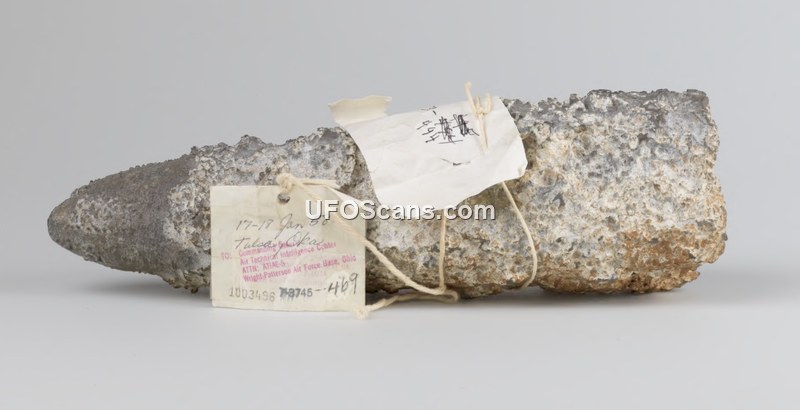 This document provides photographic evidence of a physical specimen recovered in Tulsa, Oklahoma, in January 1958. The object was processed by the Air Technical Intelligence Center and later transferred to the USAF Historical Archives.