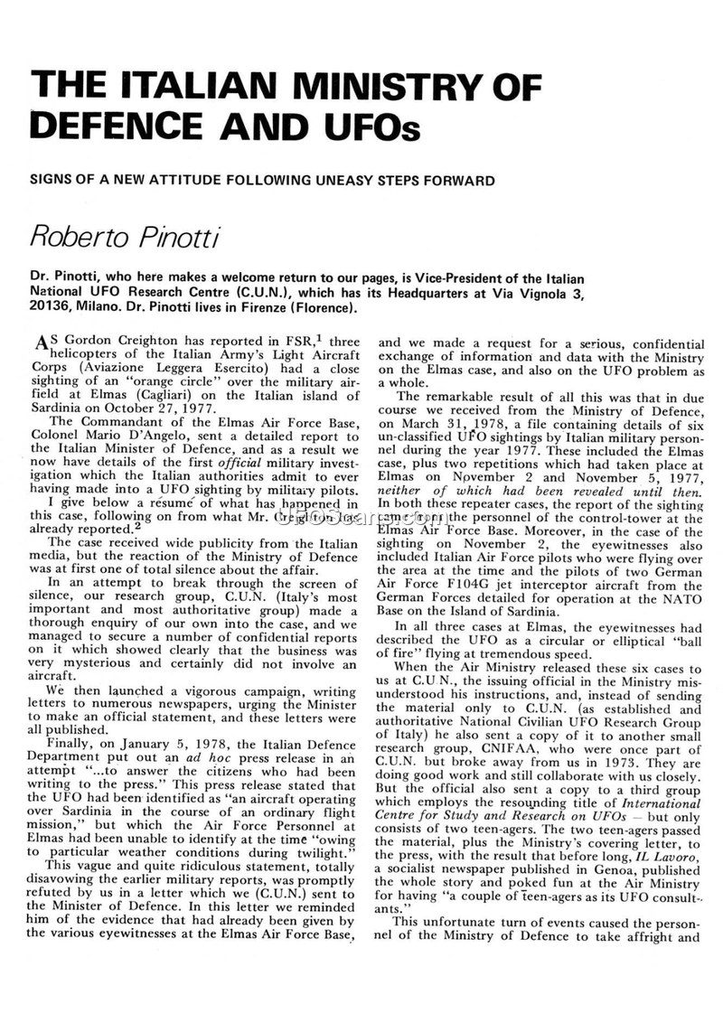 This document, published in Flying Saucer Review, contains two primary reports. The first, written by Roberto Pinotti of the Italian National UFO Research Centre (C.U.N.), details the Italian Ministry of Defence's handling of UFO reports in 1977 and 1978. Pinotti describes how C.U.N. pressured the Ministry to release information regarding sightings at Elmas Air Force Base in Sardinia, which involved military personnel and German Air Force pilots. The Ministry initially claimed the sightings were unidentified aircraft due to twilight weather conditions, but later released files on six 1977 sightings. Pinotti highlights the Ministry's embarrassment and inconsistent communication with the press. The second report, by Jun-Ichi Takanashi, details an encounter in Sayama City, Japan, on October 3, 1978. A witness, Hideichi Amano, reported an encounter with a humanoid creature inside his vehicle. The creature, described as having a round face, no neck, and a pipe-like device projecting from its mouth, emitted high-pitched noises. The encounter was accompanied by electromagnetic effects, including the failure of the vehicle's headlights and the stopping of the witness's watch. The creature eventually vanished, and the light on its stomach disappeared.