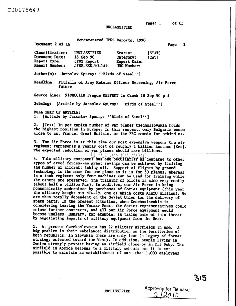 This document, a 1990 JPRS report titled 'Birds of Steel' by Jaroslav Spurny, provides an analysis of the state of the Czechoslovak Air Force during a period of significant political and military transition. The author highlights that Czechoslovakia maintains a high per capita number of warplanes, which imposes a heavy financial burden on the state. The report critiques the current military structure, noting that the Air Force is expensive to maintain and that the distribution of its 22 airfields is unbalanced, with a concentration in Slovakia that is viewed as a legacy of previous strategic orientations. The author discusses the challenges of modernization, specifically the reliance on Soviet equipment like the MiG-29, and suggests that as Czechoslovakia considers its future relationship with the Warsaw Pact, it may need to look toward Western military equipment. Furthermore, the report addresses the vulnerability of the Air Force, arguing that its current configuration would be insufficient in a local conflict against a better-equipped adversary. It suggests that the force will likely be reduced by half to align with the capabilities of nations like Belgium. The document also touches upon the internal political challenges within the military, including the vetting of generals and the high cost of pilot training. Notably, the report mentions that the MiG-29 has 'practically no civilian use' except for the investigation of 'unidentified flying objects,' a brief reference indicating the aircraft's potential utility in specialized aerial monitoring.