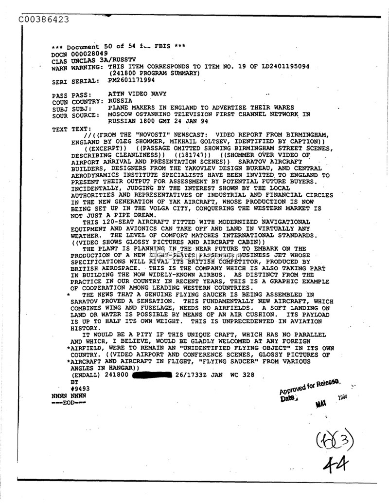 A 1994 news transcript details Russian efforts to market new aircraft in England, including a unique vehicle described as a 'flying saucer' that uses an air cushion for landing.