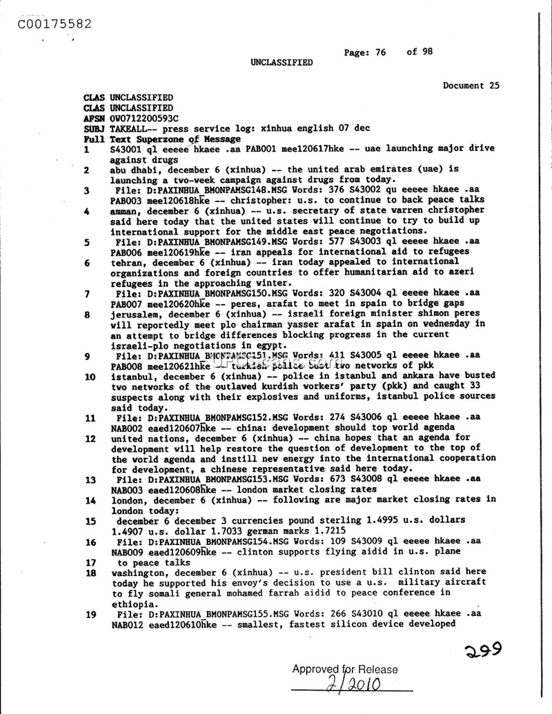 This document is a comprehensive press service log compiled by the Xinhua News Agency, dated December 7, 1993. It serves as a daily digest of international news, covering a wide array of geopolitical, economic, and social events occurring globally. The log details diplomatic efforts in the Middle East, including U.S. Secretary of State Warren Christopher's peace negotiations and meetings involving PLO Chairman Yasser Arafat. It reports on internal security matters, such as Turkish police operations against the PKK, and the aftermath of the Medellin Cartel following the death of Pablo Escobar. Economic updates include currency fluctuations, trade agreements, and industrial developments in China, Indonesia, and Australia. The document also notes humanitarian concerns, such as aid for refugees in Iran and the release of python snakes in Indonesia. Among the hundreds of news items, there is a brief mention of reports regarding unidentified flying objects (UFOs) in the Taiwan Straits, stating that nearly 6,000 sightings have been reported by experts from the Chinese mainland and Taiwan, with some experts offering rational explanations. The log concludes with various regional updates, including political shifts in Nigeria, agricultural reports from Argentina, and environmental initiatives in Thailand.