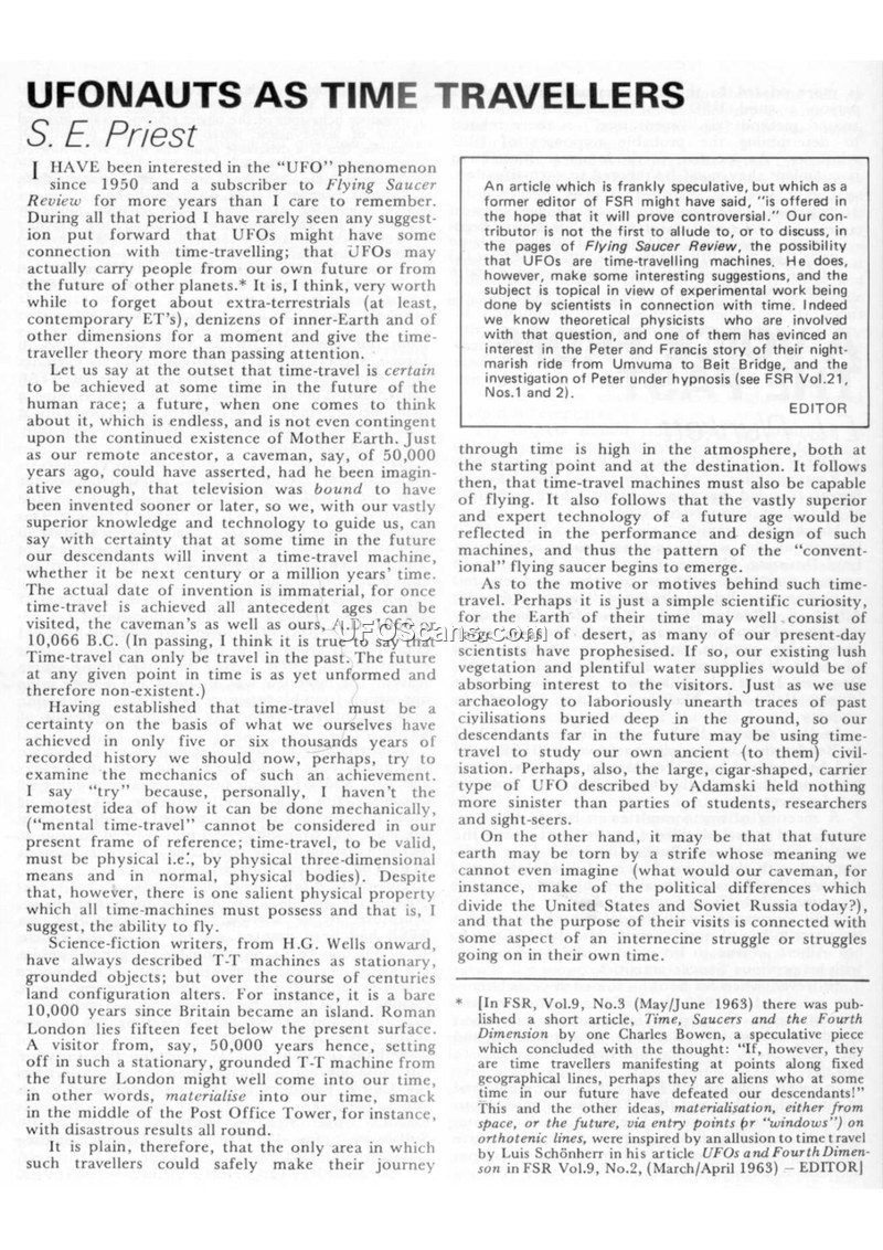 This document, published in Flying Saucer Review, presents a theoretical framework suggesting that Unidentified Aerial Phenomena (UAP) are not extraterrestrial in origin, but are instead time-travelling machines operated by future humans. The author, S. E. Priest, argues that the 'UFO' phenomenon can be explained by the mechanics of time travel, positing that these visitors are essentially 'time-travellers, not space-travellers.' The text suggests that these machines must be capable of flight and that their design reflects the technological advancements of the era from which they originate. The author further proposes that these travellers adhere to a 'no interference' rule, which explains the evasive nature of UFO sightings throughout history. The document also includes a personal account by August C. Roberts, who describes his experience attempting to photograph a UFO during a 1974 television programme titled 'UFOs - Do You Believe?'. Roberts details his technical difficulties and the subsequent anomalies he observed in his developed slides, which appeared reversed. The compilation serves as a forum for speculative discourse on the nature of UAP, referencing various researchers and previous articles within the Flying Saucer Review publication series to support the time-travel hypothesis.