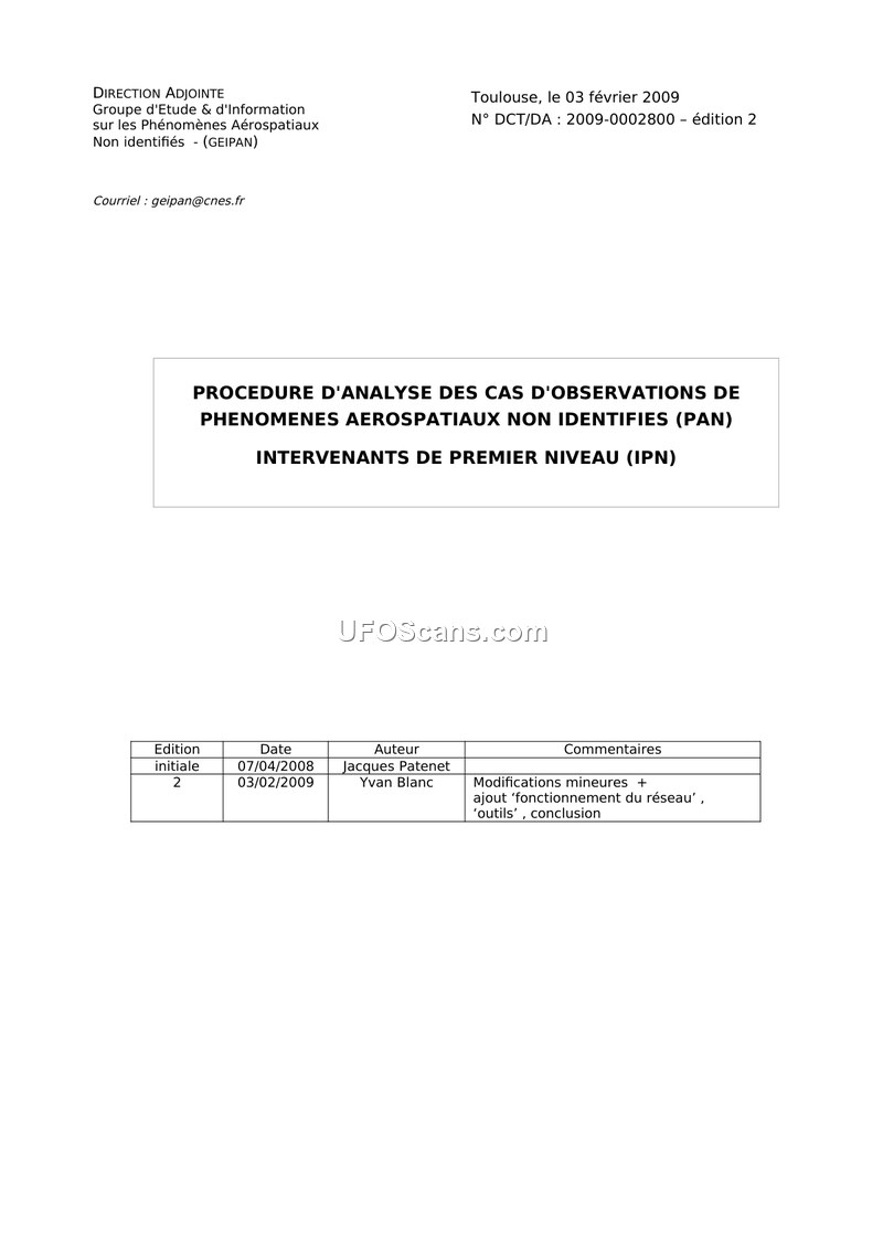 PROCEDURE D'ANALYSE DES CAS D'OBSERVATIONS DE PHENOMENES AEROSPATIAUX NON IDENTIFIES (PAN) INTERVENANTS DE PREMIER NIVEAU (IPN)