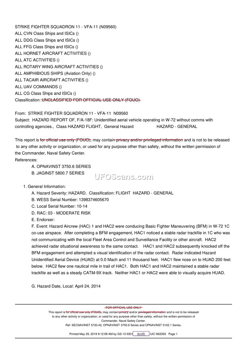 This document is a Hazard Report filed by Strike Fighter Squadron 11 (VFA-11) regarding an encounter with an Unidentified Aerial Device (HUAD) on April 24, 2014. During a Basic Fighter Maneuvering (BFM) engagement in the W-72 1C co-use airspace, two aircrews (HAC1 and HAC2) identified a stable radar trackfile that was not communicating with the local Fleet Area Control and Surveillance Facility or other aircraft. The aircrews knocked off their engagement to attempt a visual identification. The radar indicated the object was at 11,000 feet and traveling at 0.0 Mach. Despite maneuvering to within 200 feet of the contact, the aircrews were unable to visually acquire the object, although they maintained a stable radar and CATM-9X track. The report classifies the incident as a moderate risk and notes that this was the squadron's second occurrence in a single day and the third in the last ten months. The squadron's commanding officer emphasized that the operation of UAVs and other aerial devices without proper coordination poses a severe threat to Naval Aviation and requested that all activities operating within W-72 be briefed on the hazard.