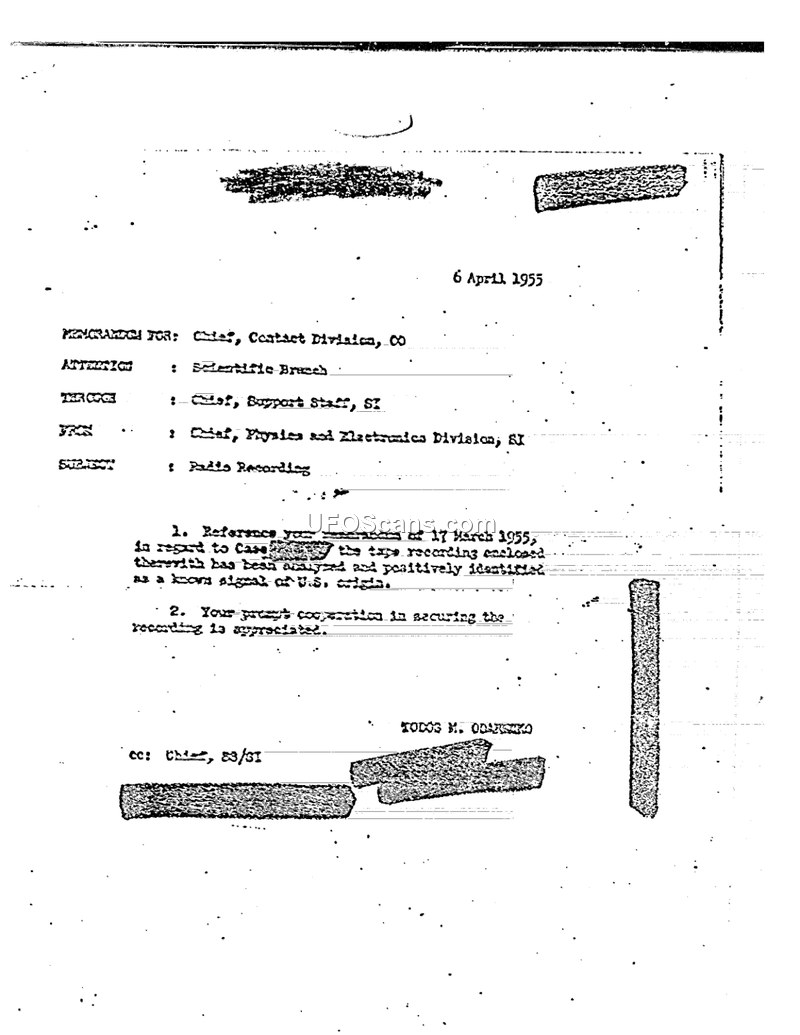 This memorandum, dated 6 April 1955, is addressed from the Chief of the Physics and Electronics Division, SI, to the Chief of the Contact Division, CO, with attention directed to the Scientific Branch. The document serves as a follow-up to a previous memorandum dated 17 March 1955 regarding a specific case, identified in the text as 'Case [illegible]'. The primary purpose of the communication is to inform the recipient that a tape recording, which had been enclosed for analysis, has been successfully evaluated. The analysis concluded that the signal captured on the recording is of U.S. origin. The author, Todos M. Odan[illegible], expresses appreciation for the cooperation provided in securing the recording. A copy of the memorandum was also sent to the Chief, 83/SI.