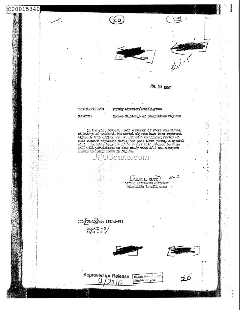 A July 1952 memorandum from the Acting Assistant Director of Scientific Intelligence confirms an ongoing review of radar and visual sightings of unidentified aerial objects. A special study is in progress with a report expected by mid-August.