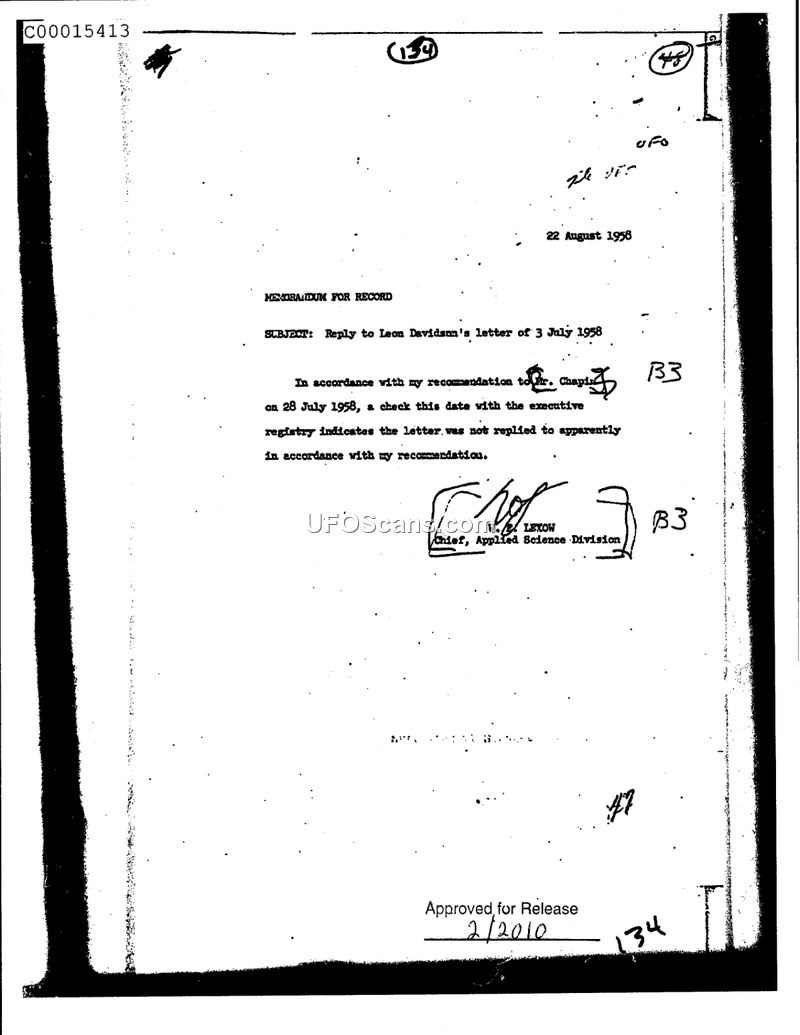This Memorandum for Record, dated 22 August 1958, serves as an internal administrative note regarding correspondence from Leon Davidson. The document addresses a letter sent by Davidson on 3 July 1958. The author, W. E. Lexow, Chief of the Applied Science Division, notes that he had previously made a recommendation to a Mr. Chapin on 28 July 1958. Following a subsequent check with the executive registry, it was determined that the letter from Leon Davidson had not received a reply, in accordance with the author's earlier recommendation.