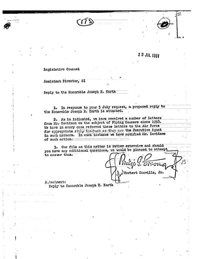 This document is a formal response from the Central Intelligence Agency's General Counsel, Lawrence R. Houston, to the Honorable Joseph E. Karth, dated July 13, 1961. The letter addresses an inquiry from Congressman Karth regarding a constituent named Mr. Davidson, who had been engaged in extensive correspondence with the Agency and the U.S. Air Force since early 1958. Mr. Davidson alleged that the CIA was withholding information and was solely responsible for creating the 'Flying Saucer' phenomenon. The Agency refutes these claims, stating that it has consistently referred all of Mr. Davidson's letters to the U.S. Air Force, which serves as the executive agent for such matters. The letter clarifies that while Mr. Davidson was provided with a declassified version of the 1953 Scientific Advisory Panel report on UFOs, he remained unconvinced. The Agency further notes that the classified portions of that report did not specifically address UFOs but rather other intelligence matters. Additionally, the document mentions that Major Lawrence J. Tacker of the U.S. Air Force had previously provided Mr. Davidson with information regarding the subject, including corrections to statements made in Captain Ruppelt's book, 'The Report of Unidentified Flying Objects.' The Agency concludes by categorically denying any involvement in the 'Flying Saucer' phenomenon or its use as a tool for psychological warfare, asserting that such beliefs are entirely unfounded.