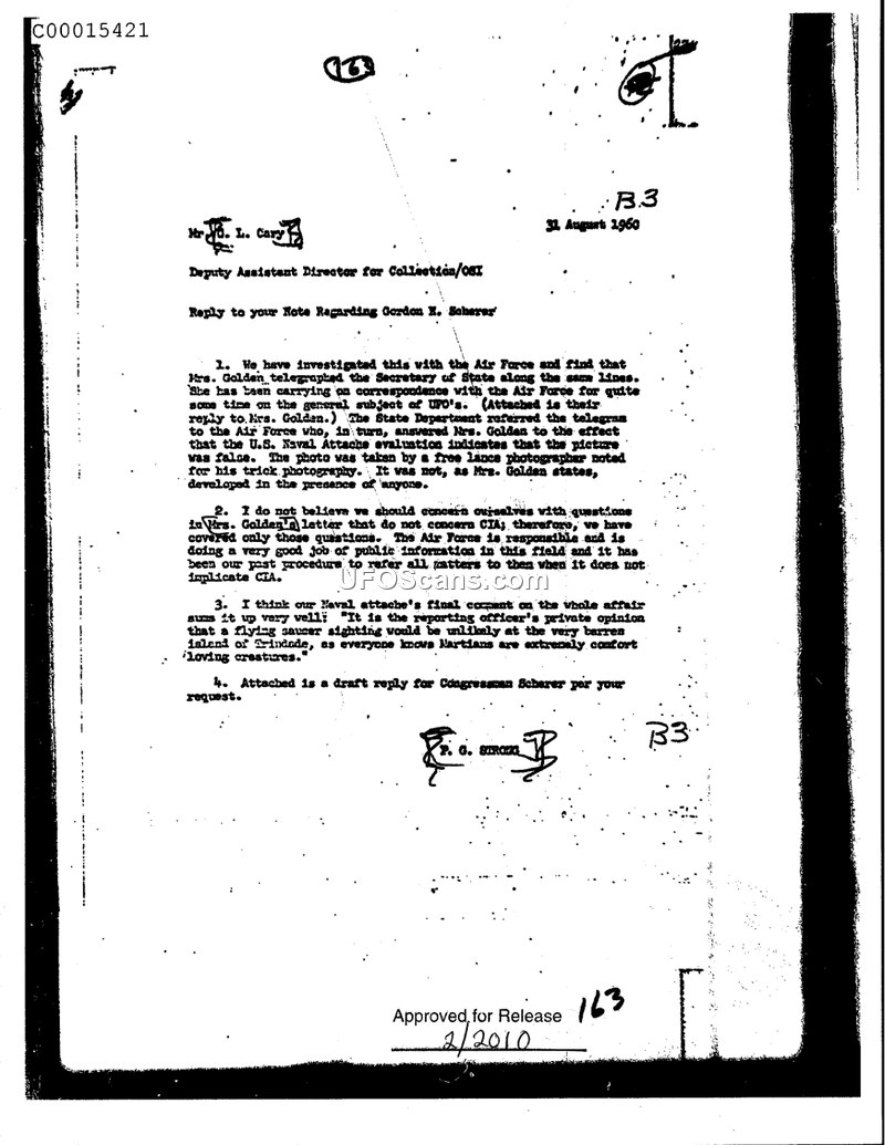 This document consists of a memorandum dated August 31, 1960, from the CIA to Congressman Gordon H. Scherer, responding to an inquiry regarding a constituent, Mrs. Catherine Carter Golden. Mrs. Golden had contacted the Congressman and the Secretary of State concerning a UFO photograph that had been featured on the Dave Garroway television show. The photograph, which allegedly depicted a UFO near the island of Trindade, Brazil, had been presented as authentic and was reportedly endorsed by the Brazilian Navy. The CIA investigated the matter in coordination with the U.S. Air Force and concluded that the photograph was a hoax. The agency identified the photographer as a freelancer known for trick photography. The memorandum advises that the CIA should not concern itself with Mrs. Golden's inquiries, as the matter does not involve the agency and the Air Force is handling public information regarding UFOs. The document includes a dismissive remark from the Naval Attache, who suggested that a sighting at the barren island of Trindade was unlikely, jokingly referencing Martians. The file also contains the original letter from Mrs. Golden to Congressman Scherer, dated August 15, 1960, in which she expresses concern over the Air Force's handling of UFO information, mentions censorship in Brazil, and urges the Congressman to support open Congressional hearings on the subject.