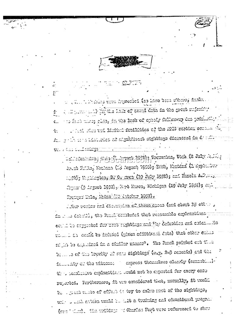 This document is the report of a Scientific Advisory Panel convened to evaluate the phenomenon of Unidentified Flying Objects (UFOs). The Panel reviewed data from 1951-1952, including reports from Project GRUDGE and Project BLUE BOOK. The Panel concluded that the vast majority of sightings could be explained by natural phenomena or misidentification of aircraft, balloons, or other conventional objects. They emphasized that there was no evidence of a direct threat to national security. A significant portion of the report focuses on the 'clutter' of low-grade reports that overwhelmed the Air Force's communication channels, which the Panel argued could potentially mask genuine hostile activity. To address this, the Panel recommended a comprehensive educational and training program to improve the ability of observers to identify objects correctly and to reduce public interest in the subject, which they believed was being fueled by sensationalism and science fiction. The Panel also discussed the potential for radar interference and the need for better signal identification. They explicitly rejected the idea that the objects were extraterrestrial in origin, noting that current astronomical knowledge made such visitations highly unlikely. The report concludes with recommendations for the Air Force to refine its reporting and investigation procedures, suggesting that the burden of proof should lie with the observer and that the military should focus on genuine scientific intelligence rather than investigating every reported sighting.