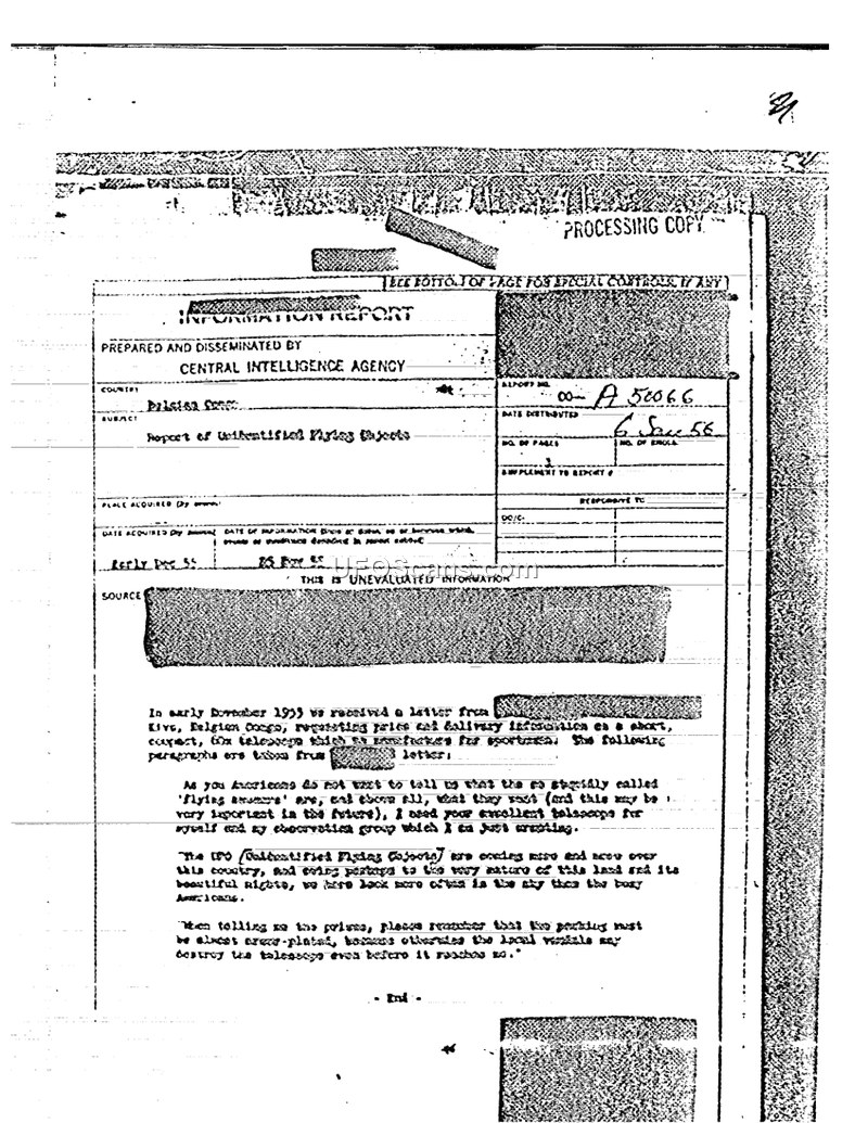 This CIA report documents a 1955 inquiry from a group in Kivu, Belgian Congo, seeking telescopes to observe 'flying saucers' they reported seeing frequently. The objects were described as having an 'almost crew-plated' surface.