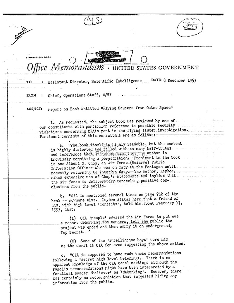This office memorandum, dated December 8, 1953, from the Chief of Operations Staff, O/SI, to the Assistant Director of Scientific Intelligence, provides an assessment of the book 'Flying Saucers from Outer Space' by Donald Keyhoe. The document was produced following a request to review the book for potential security violations concerning the CIA's involvement in UFO investigations. The reviewer characterizes the book as highly readable but filled with distortions, half-truths, and inferences, accusing the author of knowingly committing a perpetration. A significant portion of the critique focuses on the book's reliance on statements from Albert M. Chop, an Air Force (Reserve) Public Information Officer. The author of the memo notes that Keyhoe uses these statements to imply that the Air Force is deliberately concealing positive conclusions about UFOs from the public. The memo specifically addresses claims made on page 242 of the book, where Keyhoe alleges that 'CIA people' advised the Air Force to debunk UFO reports and keep the project Top Secret. The memo clarifies that these recommendations were likely a misinterpretation of CIA panel meetings and asserts that there was no recommendation to hide information from the public. The author of the memo consulted with Dr. Stefan T. Possony of the USAFOIN Special Study Group, who was unaware of any particular concern in the Pentagon regarding Keyhoe's assertions. The memo concludes that no security breach occurred and advises against taking any further action, as doing so would only serve to focus additional attention on what the author describes as 'an obvious bit of sensational science fiction.'
