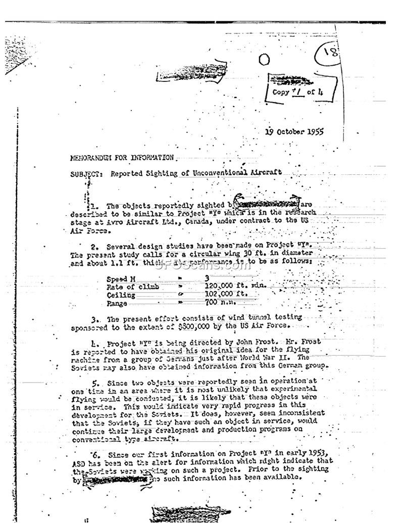 This memorandum, dated October 19, 1955, serves as an intelligence assessment regarding reported sightings of unconventional aircraft. The document links these sightings to 'Project Y,' a research initiative currently underway at Avro Aircraft Ltd. in Canada, which is operating under a contract with the United States Air Force. The memorandum outlines the technical specifications for the Project Y design, which features a circular wing measuring 30 feet in diameter and approximately 1.1 feet in thickness. The projected performance metrics for this design include a speed of Mach 3, a rate of climb of 120,000 feet per minute, a ceiling of 102,000 feet, and a range of 700 nautical miles. The project is currently supported by $800,000 in US Air Force funding for wind tunnel testing. The project is directed by John Frost, who is reported to have derived his initial concepts for the flying machine from a group of Germans active immediately following World War II. The document raises the possibility that the Soviet Union may have acquired similar information from the same German source. The author expresses skepticism regarding the likelihood that the Soviets have such objects in active service, noting that it would be inconsistent with their continued focus on large-scale development and production of conventional aircraft. The Applied Science Division has been monitoring for evidence of Soviet progress on such projects since early 1953. Because the reported sightings occurred in an area where experimental flight is considered unlikely, the document concludes that further investigation is necessary. The Air Force has arranged for technically competent personnel to interview the involved parties to gather more specific details.