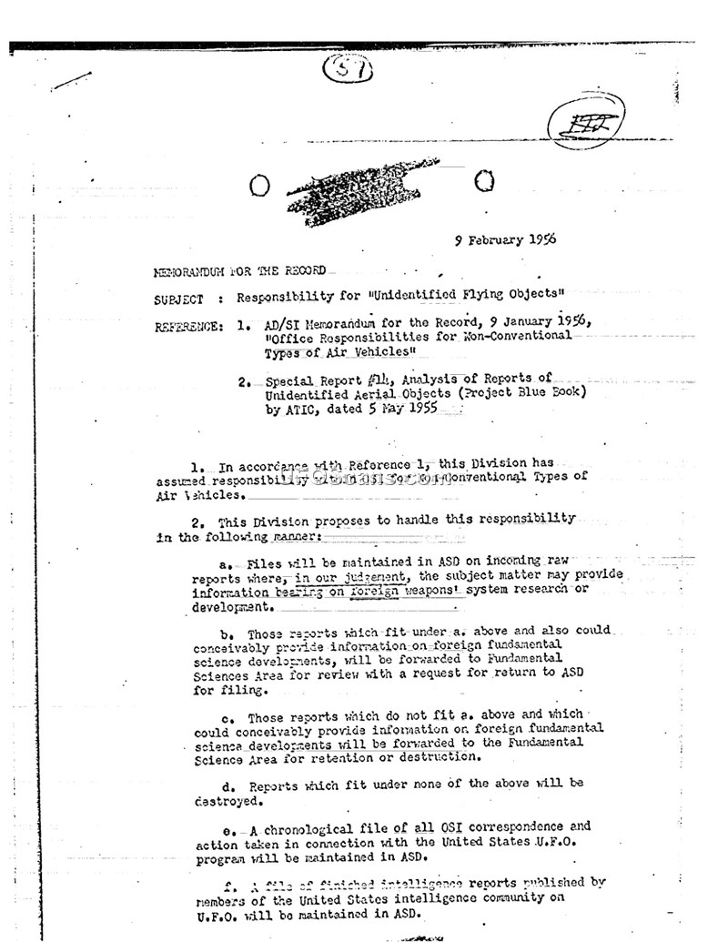 This memorandum, dated 9 February 1956, outlines the internal procedures for the Office of Special Investigations (OSI) regarding the handling of reports on 'Unidentified Flying Objects.' Referencing a January 1956 memorandum on non-conventional air vehicles and a 1955 ATIC report on Project Blue Book, the document formalizes the division's responsibility for these matters. The OSI established a strict triage system for incoming reports. Files deemed relevant to foreign weapons system research or development were to be maintained in the ASD. Reports that could provide information on foreign fundamental science developments were to be forwarded to the Fundamental Science Area for review, with a request for return to the ASD for filing. Reports that did not meet these criteria were to be destroyed. Furthermore, the memorandum mandates that a chronological file of all OSI correspondence and action taken regarding the U.S. U.F.O. program, as well as finished intelligence reports from the broader intelligence community, be maintained in the ASD. Finally, the document notes that raw intelligence and obsolete finished reports on U.F.O.s currently held in the Electronics Division were recommended for destruction to prevent the accumulation of reports that experience had shown could not be analyzed in a manner useful to the OSI mission.