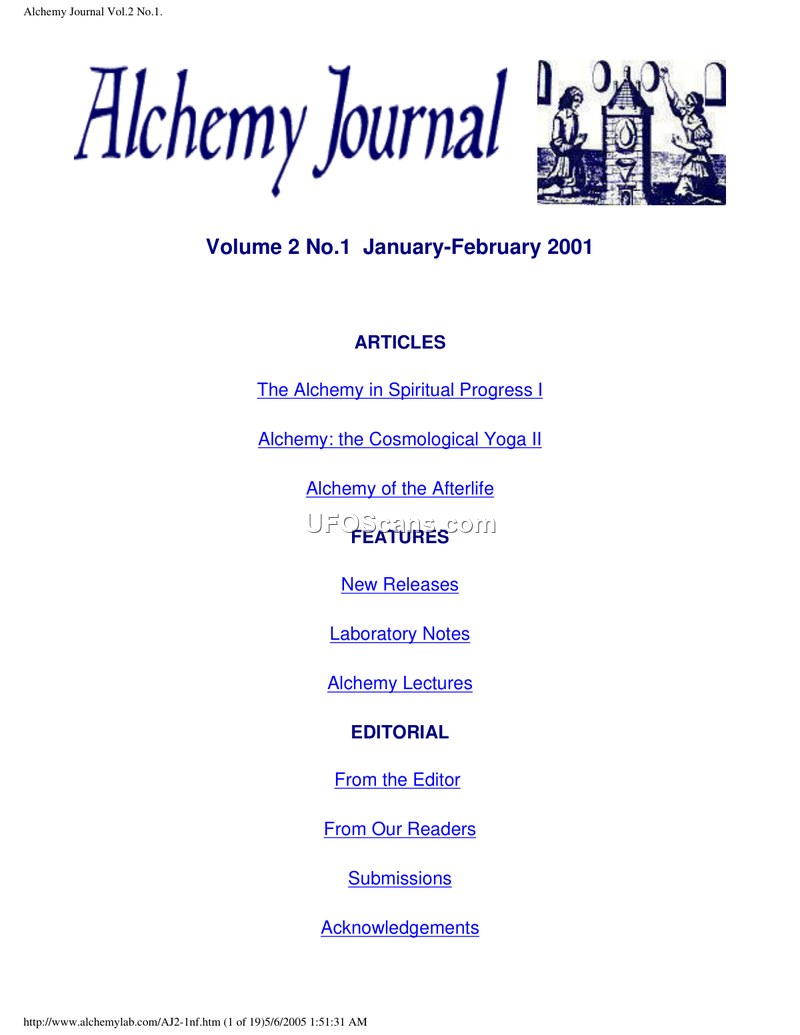 This document is the January-February 2001 issue of the Alchemy Journal, featuring articles on alchemical stages, Egyptian afterlife concepts, and practical laboratory techniques. It highlights the journal's transition to a bimonthly publication and provides resources for further study in alchemy.
