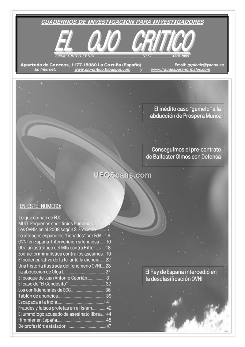 This document is the 57th issue of 'El Ojo Crítico' (EOC), a Spanish magazine dedicated to investigative journalism regarding ufology, paranormal phenomena, and criminal esotericism. Published in April 2008 by Grupo Fénix, the issue provides a critical overview of the state of ufology in Spain, focusing heavily on the history of the Spanish Air Force's (Ejército del Aire) UFO declassification process. The magazine features articles by Manuel Carballal, Salvador Freixedo, and others, who analyze the military's handling of UFO files, the role of specific researchers like J.J. Benítez and Vicente Juan Ballester Olmos, and the alleged influence of the Spanish Royal Family in the declassification process. A significant portion of the issue is dedicated to 'criminal esotericism,' including reports on ritual child murders in Africa, the 'Muti' phenomenon, and the 'Adam' case in London. The magazine also covers the 'El Condesito' case, a historical Spanish UFO incident, and provides critical commentary on the 'Movimiento Escéptico Organizado' (MEO). Furthermore, the issue includes historical analysis of Nazi-era archaeological collaborations in Spain, the use of astrology by British intelligence against Hitler, and contemporary reports on false prophets in Iraq. The magazine maintains a skeptical, investigative stance, often challenging mainstream narratives and highlighting the intersection of government secrecy, intelligence operations, and the 'mystery' community.