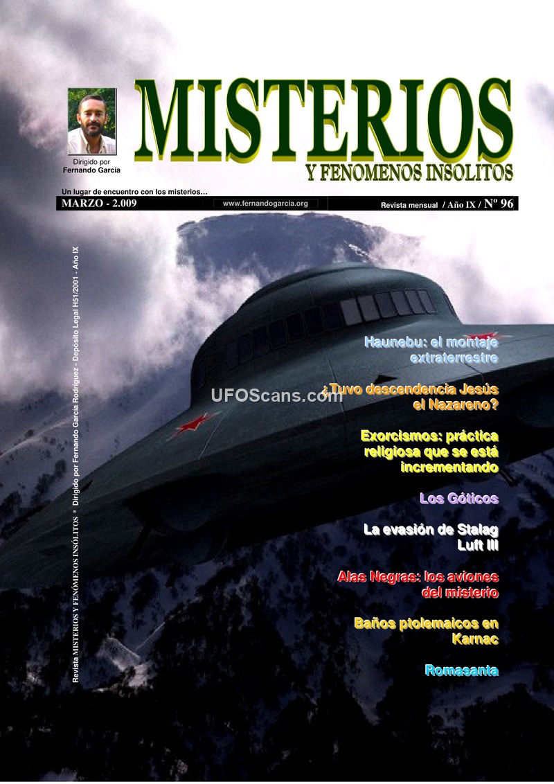 This document is the March 2009 issue (No. 96) of the Spanish magazine 'Misterios y Fenómenos Insólitos', directed by Fernando García Rodríguez. The magazine serves as a compilation of articles covering various fringe topics, including ufology, conspiracy theories, historical enigmas, and paranormal investigations. A significant portion of the issue is dedicated to the 'Haunebu' conspiracy theory, which posits that Nazi Germany developed advanced extraterrestrial-style technology, including flying saucers, and established secret bases in Antarctica and elsewhere. The articles link these theories to the 'Vril' and 'Thule' societies, the Operation Highjump expedition, and the subsequent emergence of the 'contactee' movement, featuring figures such as George Adamski and the entity Ashtar Sheran. The magazine also explores the alleged lineage of Jesus Christ through an iconographic analysis of a retablo in the Santes Creus monastery, suggesting a hidden tradition of a bloodline involving Mary Magdalene. Other sections cover the rise of exorcisms in Veracruz, Mexico; the philosophy and subculture of the 'Gothic' movement; a historical account of the Stalag Luft III escape during World War II; and an investigation into the 19th-century Spanish serial killer Manuel Blanco Romasanta, known as the 'Werewolf of Allariz'. The magazine maintains a critical, albeit speculative, tone, often questioning the veracity of the claims presented while providing a platform for various researchers and authors to discuss these topics.