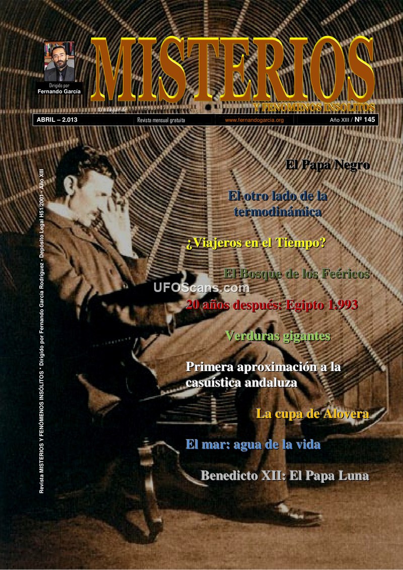 This document is the April 2013 issue (No. 145) of the Spanish magazine 'MISTERIOS Y FENÓMENOS INSÓLITOS', directed by Fernando García Rodríguez. The issue covers a wide range of topics including ufology, historical mysteries, and paranormal phenomena. A significant portion of the magazine is dedicated to the election of Pope Francis, exploring the 'Black Pope' prophecy attributed to Nostradamus and the role of the Society of Jesus (Jesuits) within the Catholic Church. Other articles discuss the 'other side of thermodynamics' in relation to free energy and UFO sightings, time travel theories, and the 'fairy forest' of the Majaceite river. The magazine also features a retrospective on a 1993 hypnosis experiment conducted by a Spanish team at the Great Pyramid of Giza, and an article advocating for the use of seawater as a free, accessible resource to combat malnutrition and disease, criticizing international organizations like UNICEF for their lack of response to this proposal. Additionally, the issue includes historical data on the 'Cupa de Alovera' (a Roman funerary monument) and the history of Pope Benedict XIII (the 'Papa Luna'). The magazine serves as a platform for independent research and investigation into fringe topics, emphasizing the director's personal perspective on the manipulation of information and the search for truth.