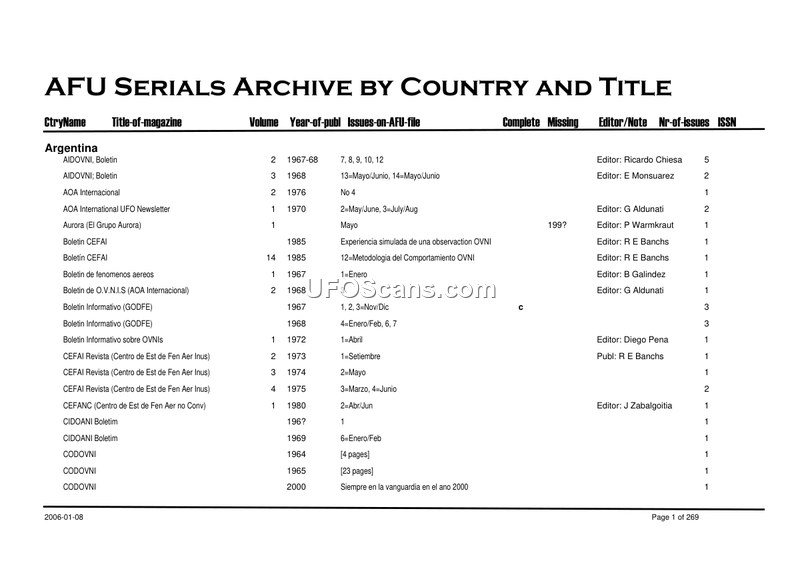 This document is a comprehensive serials archive compiled by the AFU (Archives for UFO Research), dated January 8, 2006. It serves as a reference document listing UFO and UAP-related magazines, newsletters, and bulletins from various countries. The archive is organized by country and title, providing details such as volume, year of publication, issues held in the AFU file, completeness status, missing issues, editors, and in some cases, ISSN numbers. The document covers a wide geographic range, including Argentina, Australia, Austria, Belgium, Brazil, Bulgaria, Canada, Chile, Denmark, the Dominican Republic, Estonia, Finland, France, Germany, Holland, Hungary, Iceland, India, Indonesia, Ireland, Italy, Japan, Luxembourg, Malta, Mexico, New Zealand, Norway, the Philippines, Poland, Portugal, Russia, Slovenia, South Africa, Spain, Sweden, Switzerland, Turkey, Ukraine, the United Kingdom, and the United States. The entries span from the early 1940s through 2005. The archive provides a structured overview of the global landscape of UFO-related literature, documenting the existence and publication history of numerous organizations and their respective periodicals. It notes editors, publishers, and specific issue details, highlighting the collaborative and often fragmented nature of UFO research documentation over several decades. The document is a systematic inventory intended for archival purposes, reflecting the extensive collection efforts of the AFU.