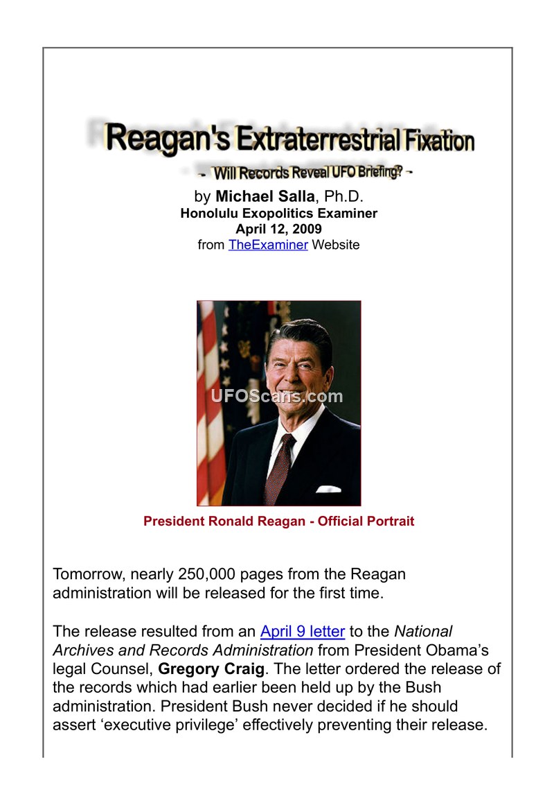 This compilation of articles by Michael Salla examines the persistent interest of President Ronald Reagan in extraterrestrial life and the potential existence of a highly classified U.S. space program. The author highlights the release of nearly 250,000 pages of Reagan administration records, prompted by an April 9, 2009, letter from President Obama's legal counsel, Gregory Craig. Salla suggests these records might clarify Reagan's frequent, often ad-libbed, references to extraterrestrial threats and the potential for global unity in the face of such an encounter. The text details several specific instances where Reagan discussed alien threats, including a 1985 summit with Mikhail Gorbachev and a 1987 address to the United Nations General Assembly. Furthermore, the author analyzes a June 11, 1985, diary entry in which Reagan mentions a shuttle capacity to orbit 300 people, interpreting this as evidence of a secret space fleet. The articles incorporate testimony from various figures, including former Lockheed Skunkworks CEO Ben Rich, whistleblower Edgar Fouche, and former NASA employee Clark McClelland, to support the theory of an advanced, antigravity-based space fleet operating under U.S. Strategic Command. The document concludes by suggesting that the newly released records may finally reveal the truth behind these claims and the nature of the briefings Reagan may have received.