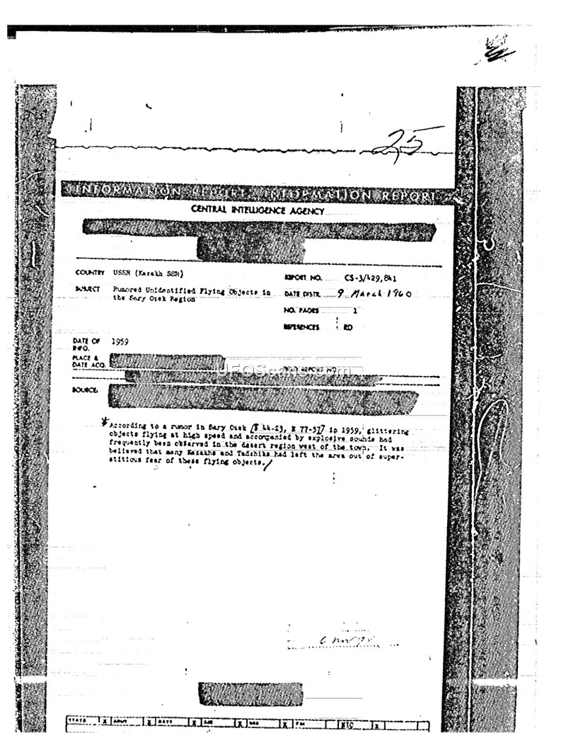 This CIA report documents 1959 rumors of high-speed, glittering objects and explosive sounds in the Sary Ozek region of the Kazakh SSR. The sightings reportedly caused local populations to flee the area due to fear.