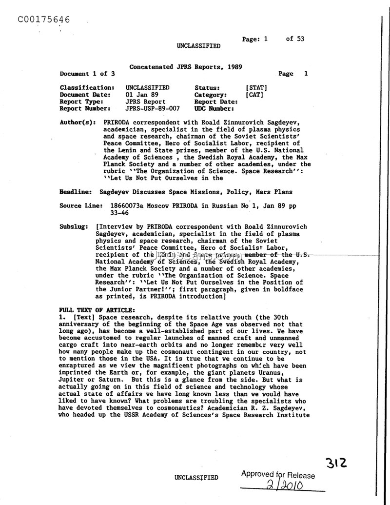 Sagdeyev Discusses Space Missions, Policy, Mars Plans