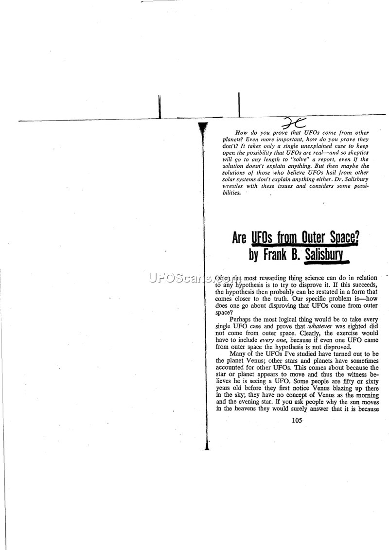 This document is a chapter titled 'Are UFOs from Outer Space?' by Frank B. Salisbury, published in the 1980 compilation 'Proceedings of the First International UFO Congress.' Salisbury, a scientist, explores the scientific validity of the extraterrestrial hypothesis regarding Unidentified Aerial Phenomena (UAP). He begins by discussing the difficulty of proving or disproving the hypothesis, noting that skeptics often attempt to 'solve' cases by dismissing evidence that does not fit their preferred explanations. He cites several examples, including the planet Venus being mistaken for a UFO, and the Mantell skyhook balloon incident, to illustrate how some sightings have prosaic explanations. However, he also examines more complex cases, such as the Travis Walton incident in Snowflake, Arizona, and sightings in the Uintah Basin, which he finds more difficult to dismiss as simple hoaxes or misidentifications. Salisbury critiques prominent UFO skeptics like Philip Klass, Donald Menzel, and Ernest Taves, arguing that their approach of declaring cases as hoaxes based on perceived motives is unscientific and often ignores contradictory evidence, such as polygraph results. He also touches upon the 'contactee' phenomenon, referencing figures like George Adamski and Antonio Villas-Boas, and expresses skepticism toward their claims. Throughout the text, Salisbury maintains a balanced, albeit cautious, perspective. He admits that he is not convinced that UFOs are extraterrestrial machines, but he is equally unconvinced by the dismissive 'debunking' methods employed by some researchers. He concludes that while science should be applied to the study of UFOs, the current data is insufficient to reach a definitive conclusion, and the phenomenon remains a complex, frustrating, and potentially profound mystery that requires more rigorous and open-minded investigation.