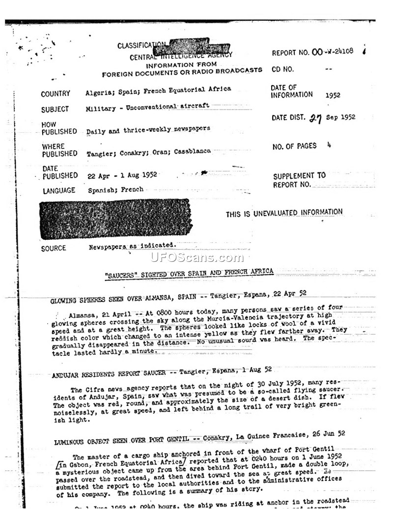 This CIA intelligence report compiles multiple newspaper accounts of UFO sightings in Spain, Algeria, and French Equatorial Africa during 1952. The document highlights consistent reports of high-speed, silent, and maneuverable aerial objects observed by various witnesses.