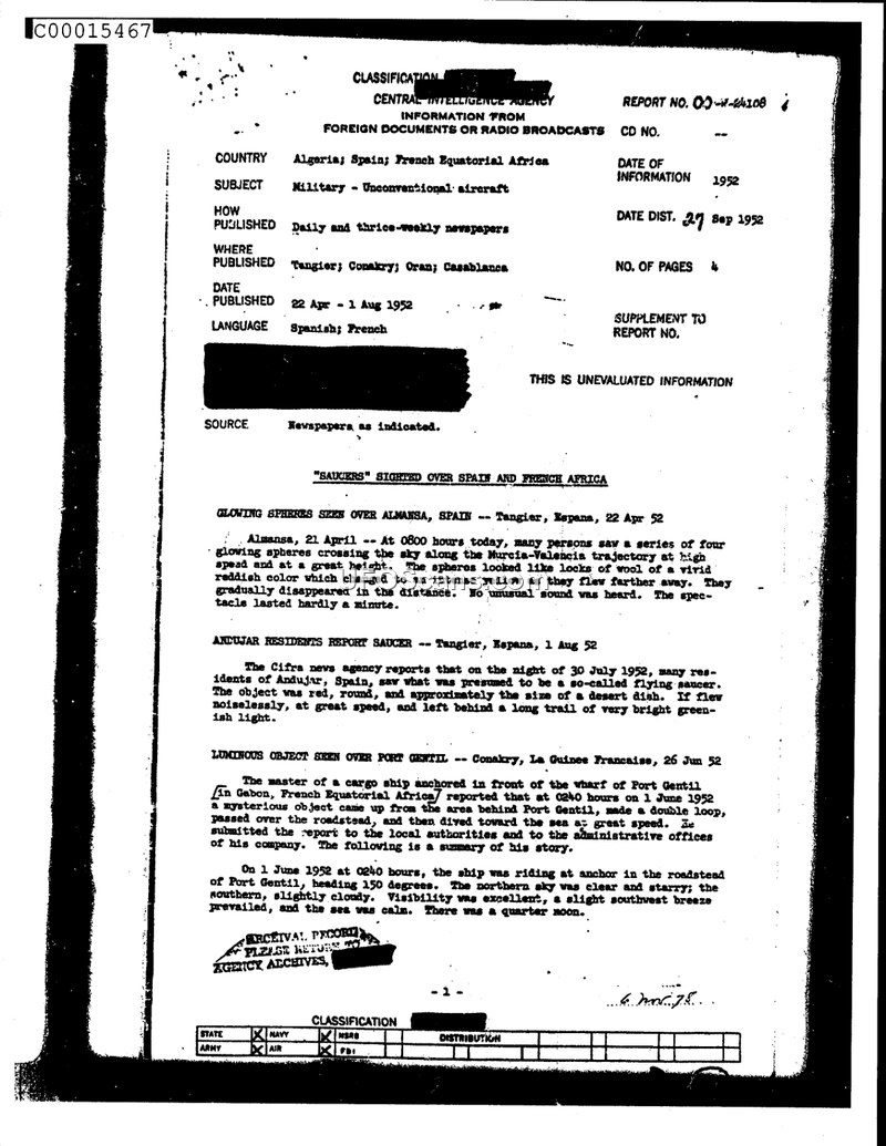 This document is a Central Intelligence Agency report dated 27 September 1952, compiling a series of reports regarding sightings of unconventional aircraft, referred to as 'saucers,' over Spain, Algeria, and French Equatorial Africa between April and August 1952. The report presents these accounts as unevaluated information derived from various newspapers, including Cifra, L'Echo d'Oran, and La Vigie Marocaine. The sightings describe a variety of phenomena, including glowing spheres, luminous objects, and disc-shaped or cigar-shaped craft. Notable incidents include a report from 21 April 1952 in Almansa, Spain, where four glowing spheres were observed moving at high speed. On 1 June 1952, the master of a cargo ship off the coast of Port Gentil, French Equatorial Africa, observed a luminous orange object that moved in a double loop before departing at high speed. In Algeria, multiple sightings were reported throughout July 1952. In Oran, witnesses described plate-shaped objects, incandescent white masses, and brilliant discs. In Tlemcen, a Public Works Department employee reported a flying object moving rapidly north, trailing a whitish smoke cloud. The report notes that these sightings were becoming frequent enough that the newspaper L'Echo d'Oran began publishing a series on the occurrences, highlighting that the observers included credible individuals such as policemen, colonists, a priest, and a cadi. The document serves as a summary of these regional reports without providing an official intelligence conclusion regarding the nature of the objects.