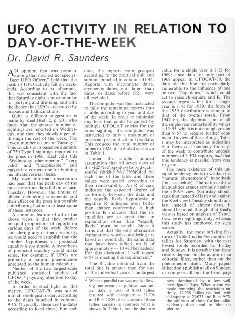 This document, authored by Dr. David R. Saunders, provides a statistical analysis of UFO sighting reports categorized by the day of the week they occurred. The paper addresses the popular notion that UFO activity peaks on weekends, a theory often cited by those who attribute sightings to hoaxes or hallucinations linked to social behavior. Saunders also discusses a competing theory proposed by Keel, which suggests a peak in sightings on Wednesdays. To investigate these claims, Saunders utilized data from the UFOCAT-70 database, which contains records from 1921 to 1970. To minimize bias, the data was processed to count only a maximum of one event per political unit per date. The resulting analysis, presented in Table 1, includes chi-square statistics to test the hypothesis that sightings are equally likely to occur on any given day. The author notes that while some years show significant deviations, these results are often influenced by external factors, such as the editorial decisions of newspapers to publish more reports on certain days or the impact of well-publicized 'flaps.' Saunders argues that the observed inequalities in the data do not provide strong evidence for the 'natural phenomenon' hypothesis and suggests that the reporting process itself is a significant variable. The paper concludes by noting that the data is complex and that the 'Wednesday phenomenon' or other day-of-the-week trends are likely artifacts of human reporting behavior rather than inherent characteristics of the UFO phenomenon itself. The document includes a comprehensive table of data spanning nearly five decades, illustrating the distribution of reports across the week.