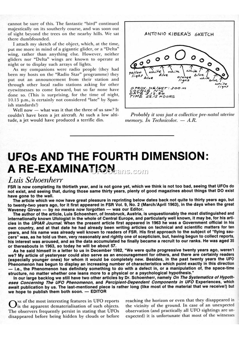 This document consists of articles from the Flying Saucer Review (FSR). The first section features a personal account and sketch by Antonio Ribera regarding a sighting in Spain on December 3, 1984, of a large, metallic, delta-shaped object with lights. The primary article, written by Luis Schoenherr, re-examines the UFO phenomenon through the lens of the 'fourth dimension.' Schoenherr, a long-time ufologist, argues that the apparent dematerialization and reappearance of UFOs, as well as their metallic appearance and radar signatures, can be explained by the hypothesis that these objects exist in a fourth dimension and only partially project into our three-dimensional space. He discusses various possibilities, including that UFOs are time machines or craft from other dimensions, and addresses the reports of 'contactees' who claim to see beings without space suits. The document also includes a secondary article by Paul Whitehead, which explores the intersection of quantum mechanics, parallel universes, and faster-than-light travel (tachyons) as potential scientific frameworks for understanding UFO propulsion and communication. The text concludes with a list of UFO-related publications and a compilation of historical sighting reports.