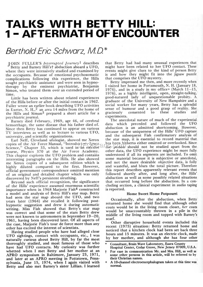 This document, authored by Dr. Berthold Eric Schwarz, examines the long-term aftermath of the 1961 UFO abduction of Betty and Barney Hill. Dr. Schwarz, a psychiatrist, argues that the Hills' experience should not be viewed in isolation but as part of a broader, ongoing series of events. The text details various 'disruptive household events' reported by Betty Hill, such as malfunctioning electrical appliances, clocks, and strange occurrences involving household items. The author also discusses the Hills' interactions with ufologists and researchers, including the analysis of a star map by Marjorie Fish. A significant portion of the document covers the Hills' claims of being monitored or harassed by government agencies, including reports of tapped telephones and visits from individuals posing as utility workers or military personnel. The document also includes a separate report by Ann Druffel titled 'Encounter on Dapple Lane: Part 2,' which details a hypnotic session with a witness named John Hodges regarding a 1976 encounter. Throughout the text, the author maintains a clinical interest in the psychological and experiential data surrounding these reports, advocating for a comprehensive study of all segments of the abduction phenomenon.