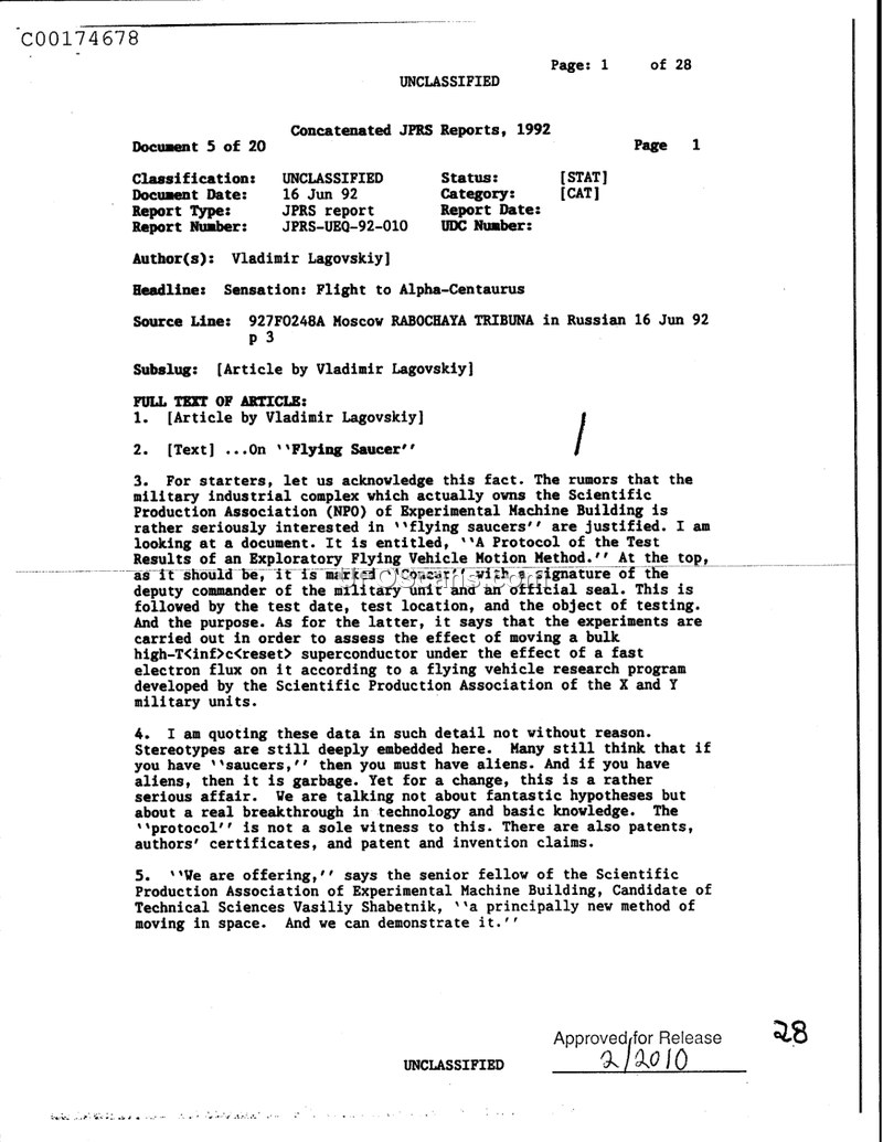 This document is a 1992 JPRS report containing an article by Vladimir Lagovskiy regarding claims made by Vasiliy Shabetnik, a senior fellow at the Scientific Production Association of Experimental Machine Building. The article discusses theoretical research into 'flying saucers' and advanced propulsion systems. Shabetnik describes a concept for a space vehicle utilizing a high-temperature superconductor airframe and fast electron emitters to interact with the Earth's geomagnetic field, theoretically allowing for interstellar travel. The author notes that while these ideas are presented as a breakthrough in technology, they are framed within the context of experimental research rather than proven reality. Furthermore, the article details Shabetnik's claims regarding 'energy conversion,' a process he suggests could extract energy from matter, potentially replacing traditional power plants and providing fuel for space travel. The report emphasizes that these concepts are in the exploratory stage and are intended to challenge existing statistical and probabilistic scientific models.