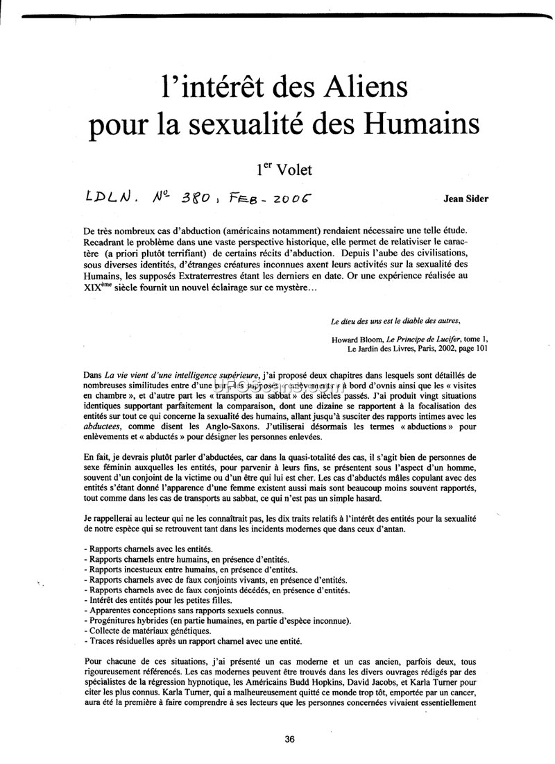 This document, published in the French journal 'Lumières Dans La Nuit' (LDLN) across issues 380, 381, and 382 in 2006, presents a historical and analytical overview of the alleged interest of non-human entities—referred to as 'Aliens' or 'Extraterrestrials'—in human sexuality. Author Jean Sider posits that modern abduction reports are not isolated incidents but part of a multi-millennial phenomenon that has been historically interpreted through various cultural and religious frameworks, such as demonic possession, incubi, and succubi. Sider draws parallels between ancient legends, medieval witchcraft trials, and contemporary abduction accounts, noting that these entities have consistently been described as interacting with humans in ways that involve sexual contact, the collection of genetic material, and the creation of hybrid offspring. The text references numerous researchers and authors, including Eve Lorgen, David Jacobs, and Karla Turner, to support the argument that these entities utilize 'virtual reality' or psychological manipulation to influence the perceptions of their victims. The document also explores the role of the Inquisition in documenting these encounters, framing them as 'commerce with the Devil.' Sider concludes that while modern science and skepticism attempt to rationalize these experiences as psychological or hallucinatory, the consistency of the reports across centuries suggests a persistent, external phenomenon that transcends specific historical eras and belief systems.